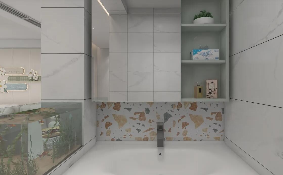 卫生间采用干湿分离的简洁设计,能够满足家人之间的同时使用。其中洗漱区划分在外,小清新水磨石的装点看起来有质感却不失生活浪漫;淋浴区划分在里,中间以玻璃门隔档也便于日常清洁打扫。