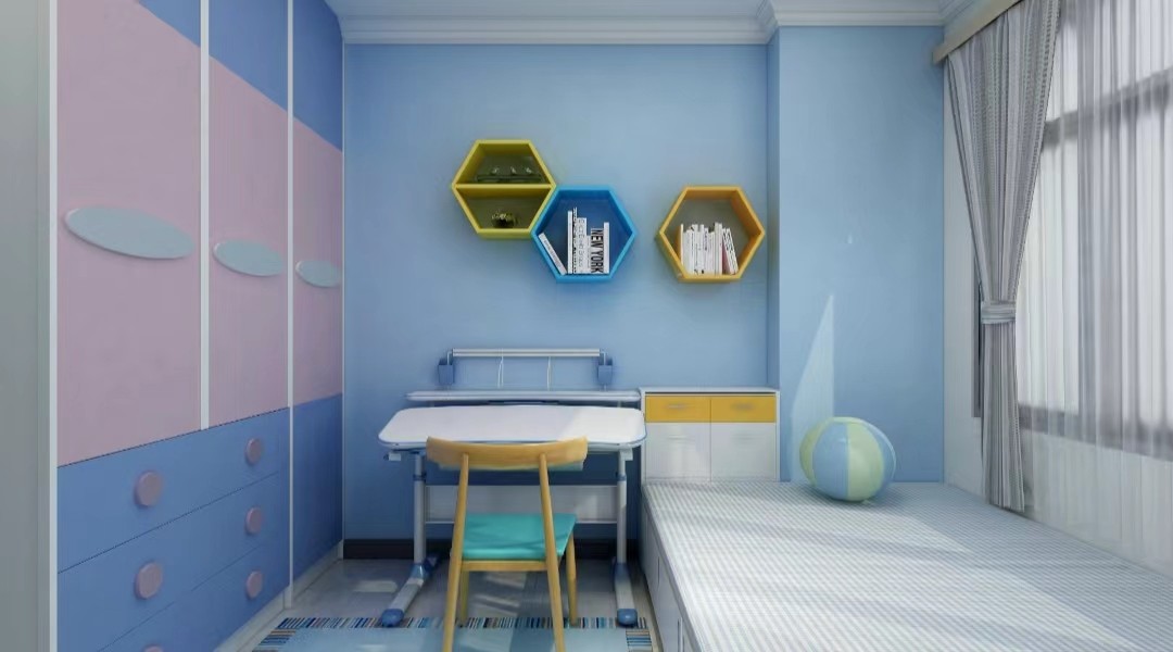 男儿童房采用蓝为主色调,使用榻榻米,进行节省空间增加储物功能。