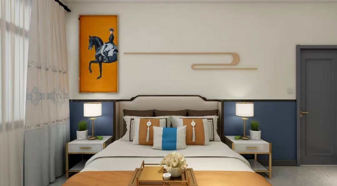 主卧设计配色采用孔雀蓝,金色的点缀,使空间出现了很多层次感。