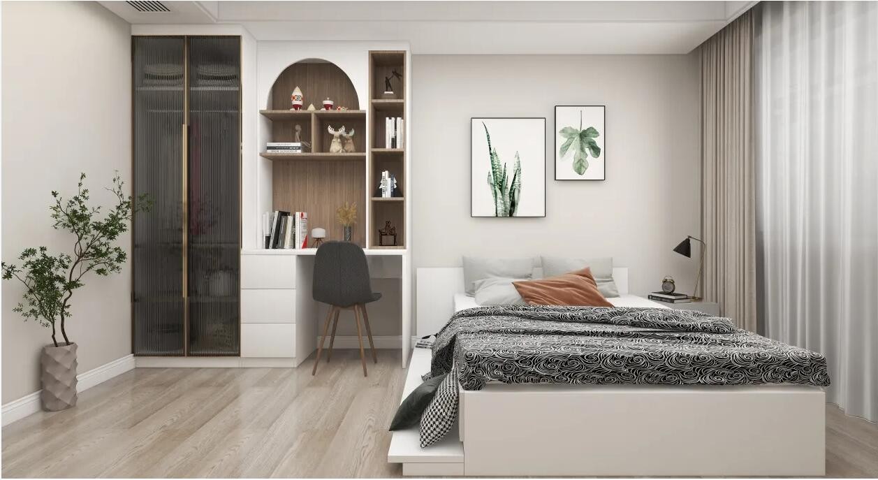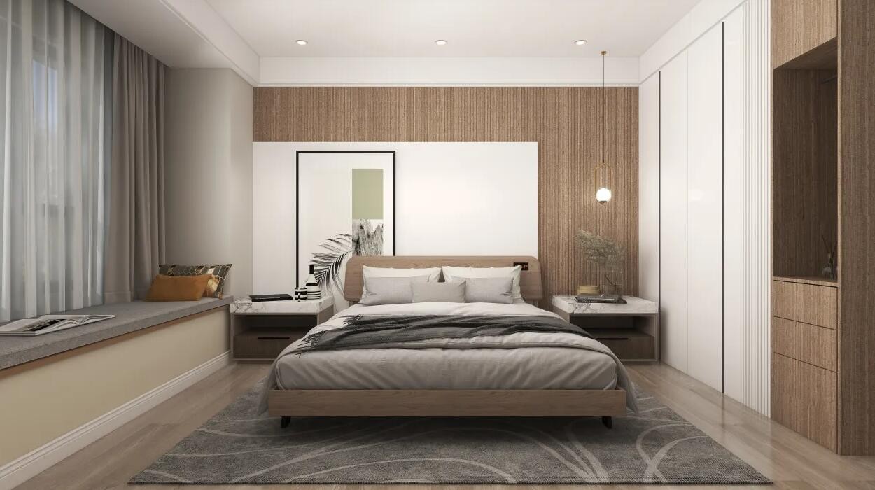 主卧的背景墙木饰面板与白色面板相结合,与客餐厅基调相呼应,大量原木色元素充斥着整个空间,描绘出一幅温馨的画卷
