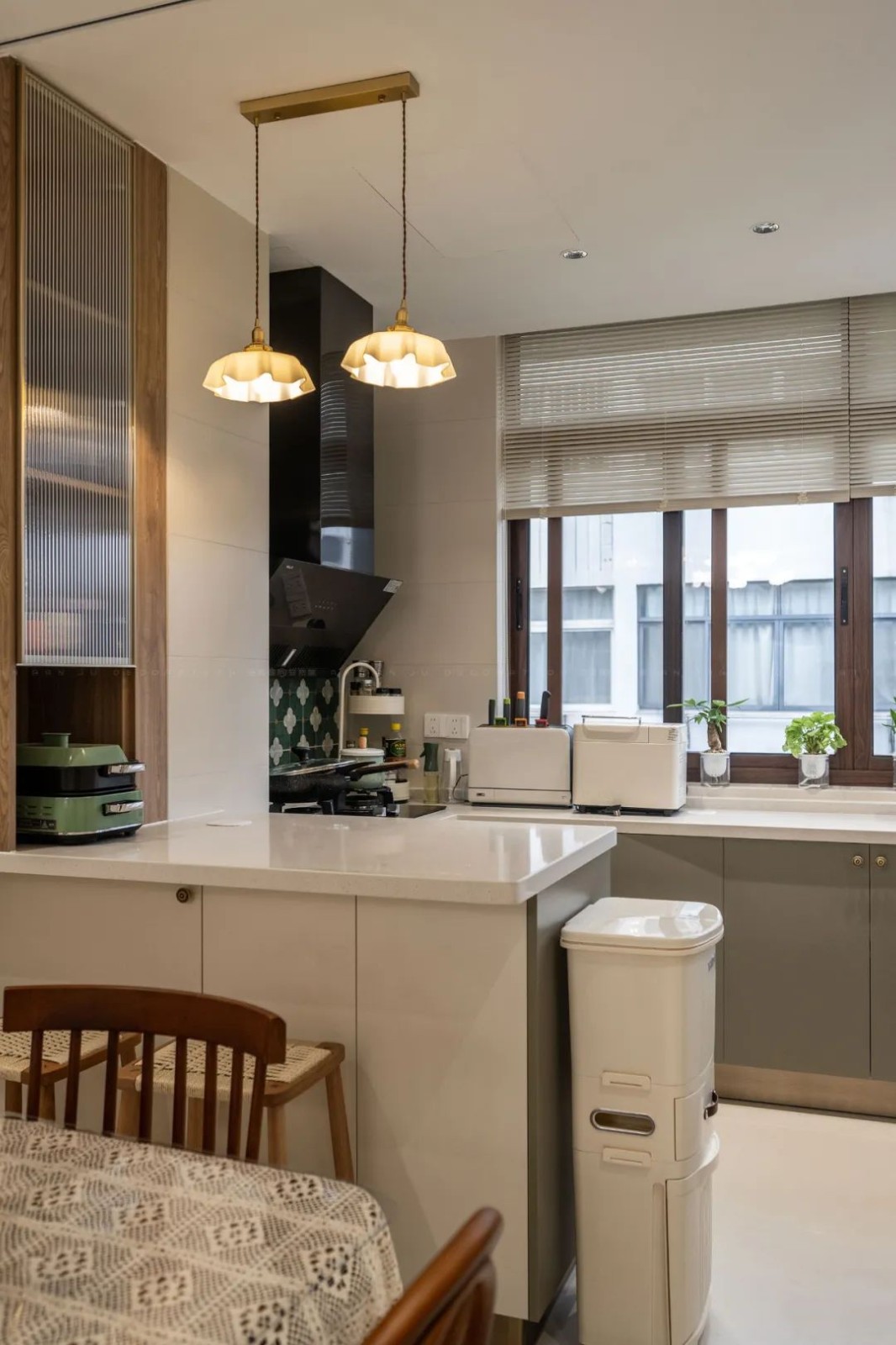 在厨房拆掉的墙壁处上方顺势打造一个储物柜,增加储物空间,下方柜子延伸出来做了一个小台面,无论临时放置菜品,还是早上用个简餐都极为方便。