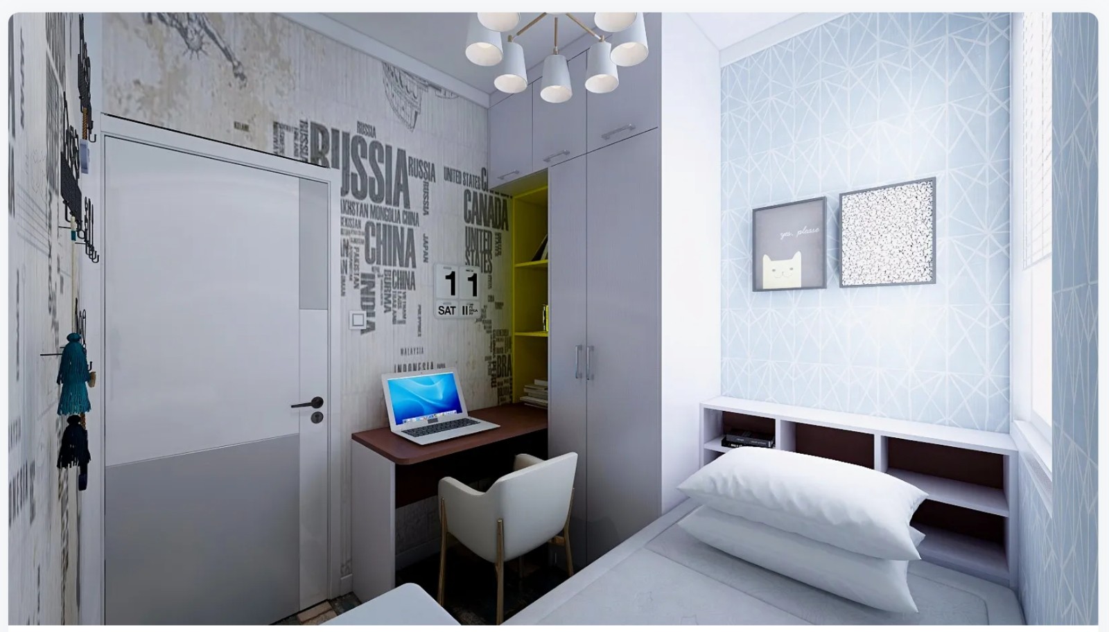 榻榻米床设计,床链接定制衣柜,衣柜书桌一体化设计,使空间使用上***化。