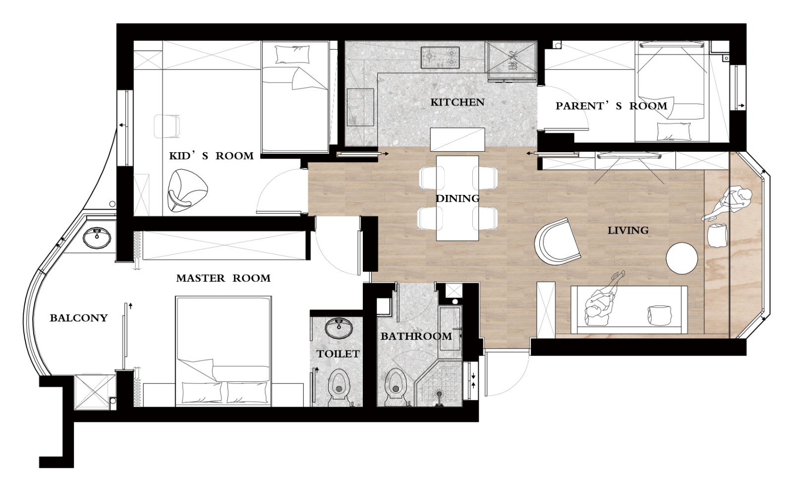 一套05年的学区房,说不上太新,也算不上很旧,业主一家三代人为了孩子上学居住在这儿。房子本身并无不好,客厅虽然朝北但采光和视觉通透性都算上乘,主卧朝南还自带阳台。 解决的问题是增加一间卧室供老人使用,经过规划,我们将厨房与餐厅整合在一起,这样就留出原厨房空间改造为老人房。改造后的厨房与餐厅之间设计可敞开可封闭的隐藏式移门,解决日常烹饪油烟问题。我们在主卧设计了一个独立的卫生间。
