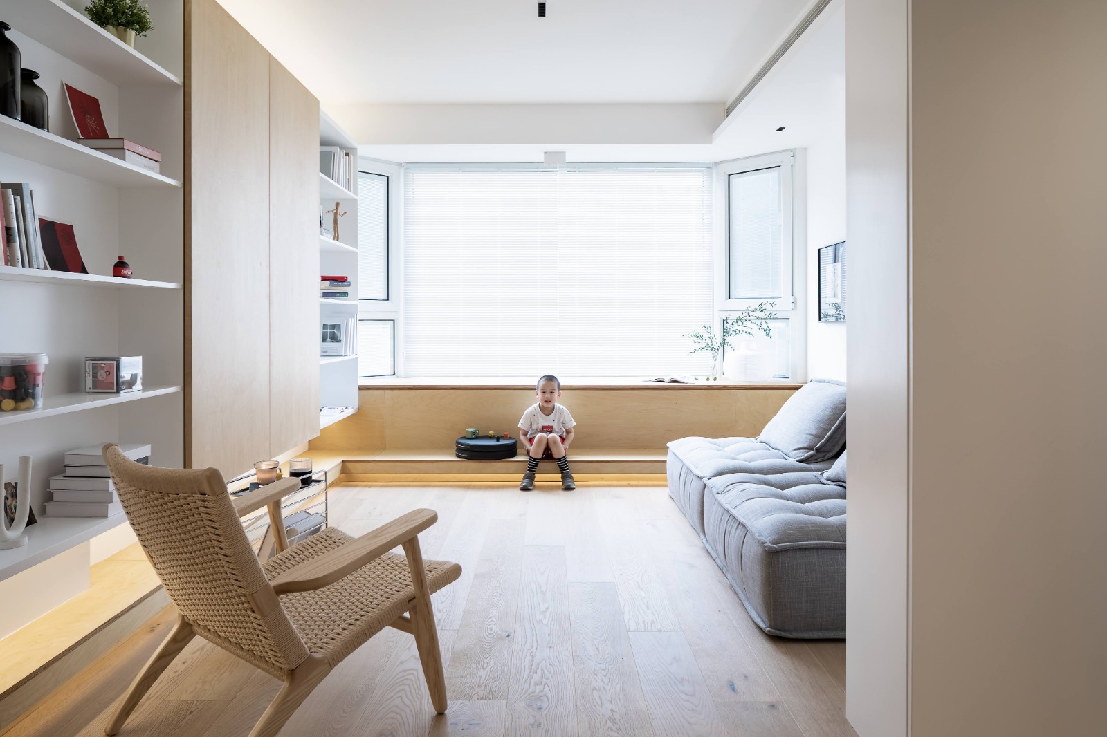 客厅有一整面飘窗,飘窗在住宅中可塑性不大,但在这个空间里却起到了极重要的作用。