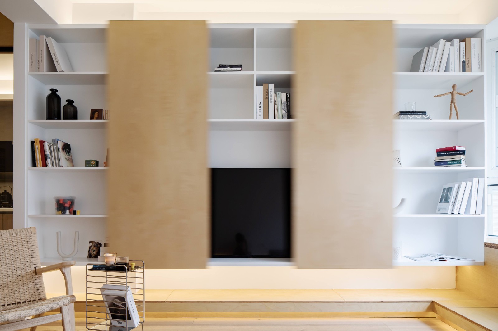 现场制作的电视柜及滑动柜门。电视墙面装饰柜在不需要看到电视时,可以把移门合起来,以此保持敞开部分的和谐与统一。