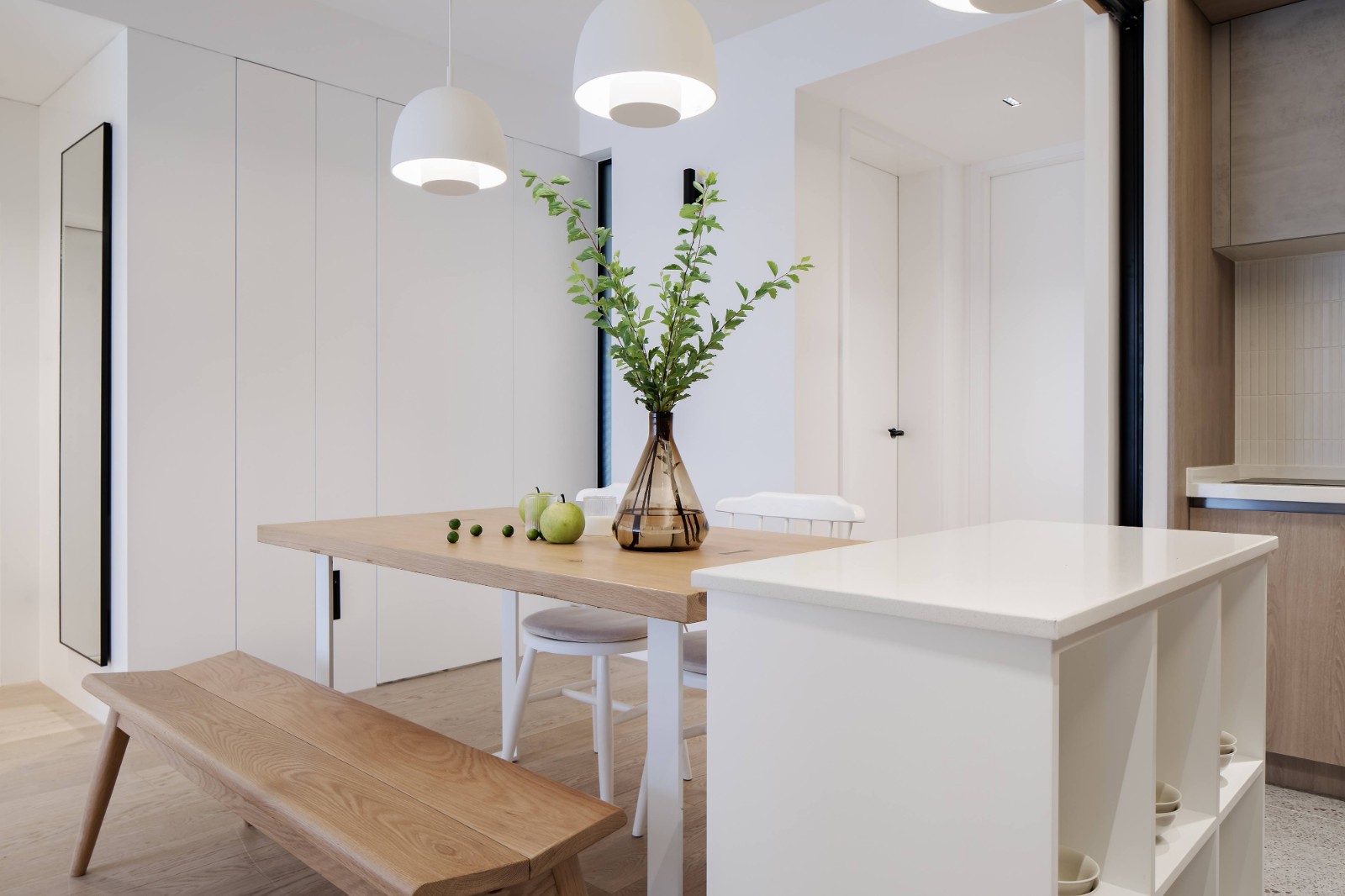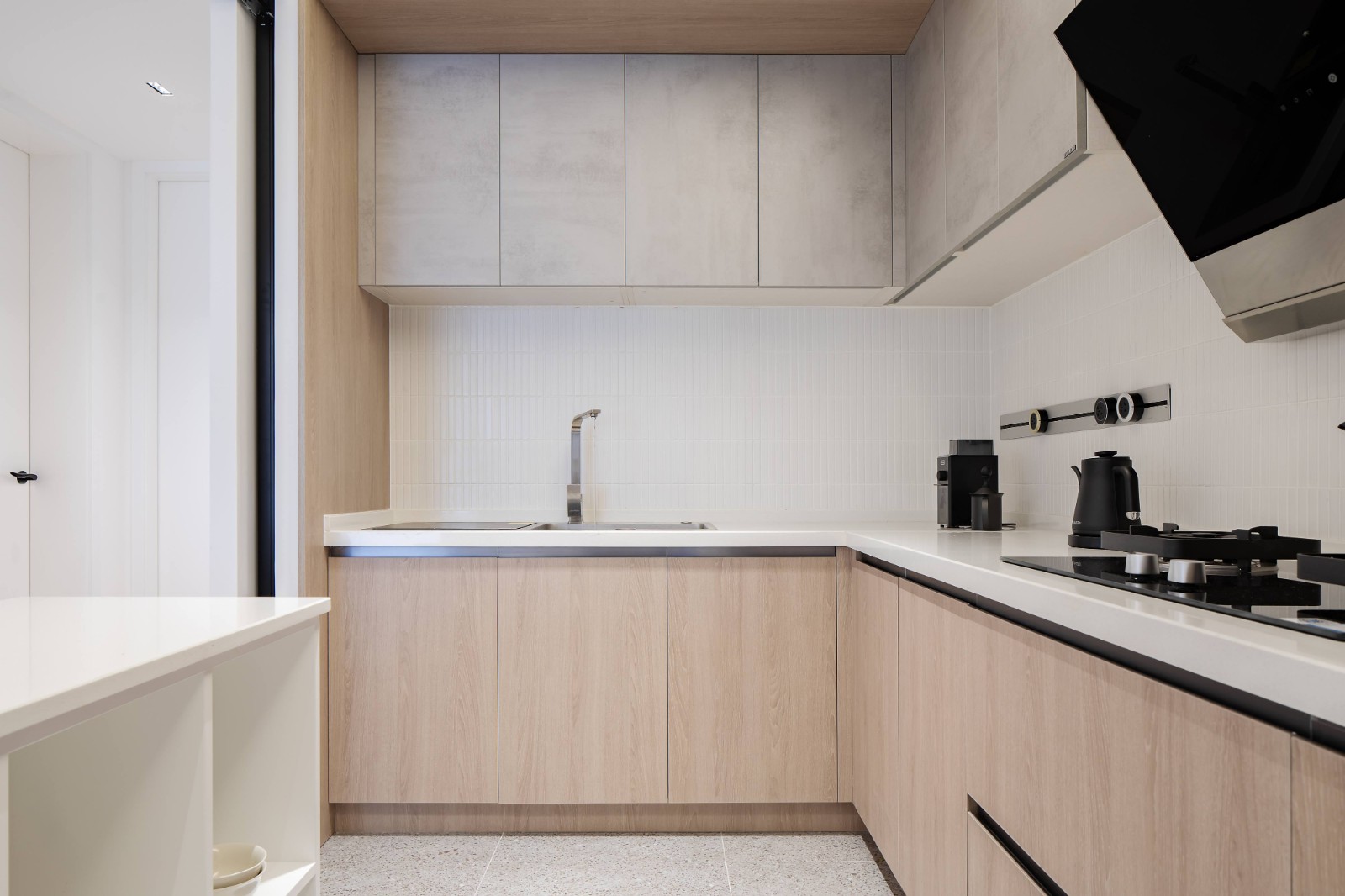 利用厨房空间做了一个餐边柜与餐桌连接,增加操作台面的同时,反向对厨房做敞开柜形式使用。墙面使用白色小砖,增强空间的线条感;并用移动滑轨式插座替代传统插座,使墙面更加整洁干净。