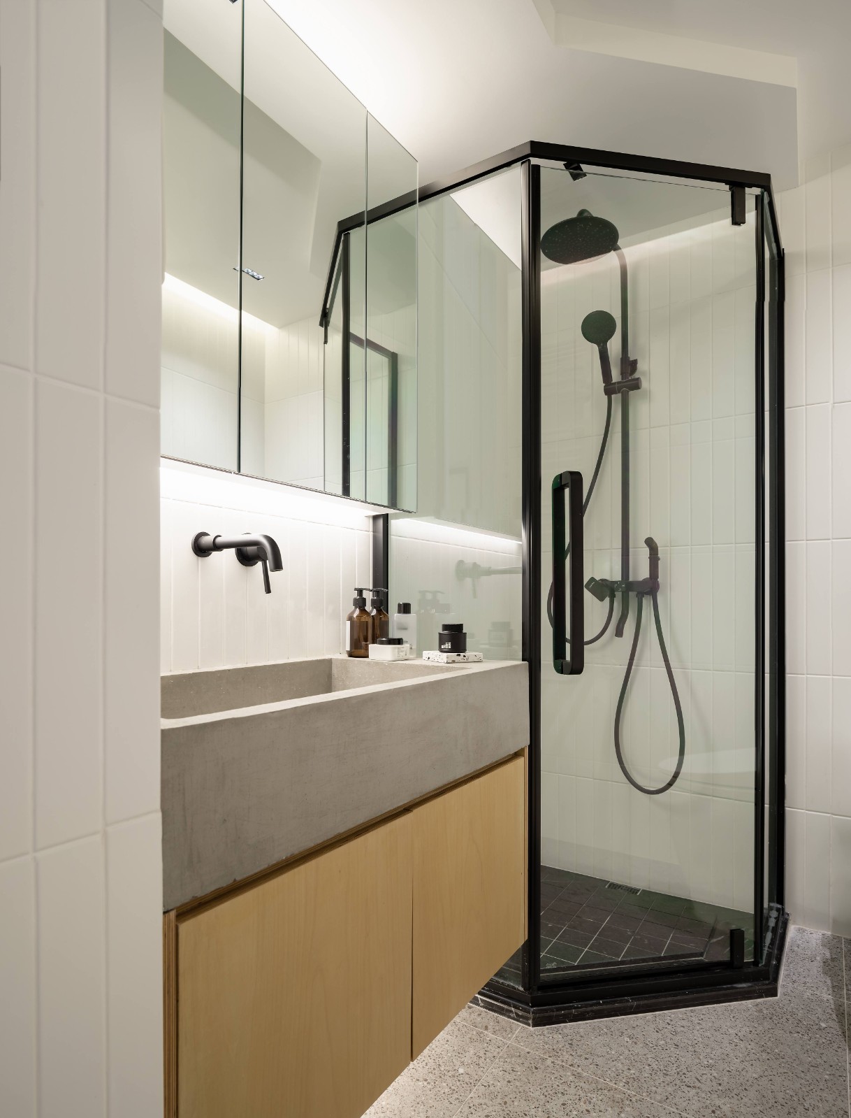 卫生间台盆柜是现场水泥现浇制作,在比较小的空间里现场制作利用率会更高;墙面小砖和缝隙线条让原本紧促的空间显出盈余的延伸感。