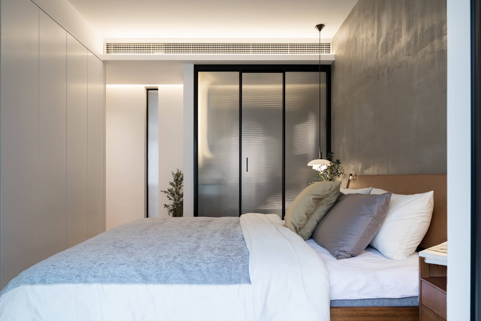 为了避免日常同时洗漱造成冲突,我们特别在主卧设计了一个独立的卫生间,卫生间的水泥艺术涂料与床头墙面遥相呼应,给空间以延伸感,不会让人因增加了一个卫生间而感到主卧的空间尺度被压缩变小了