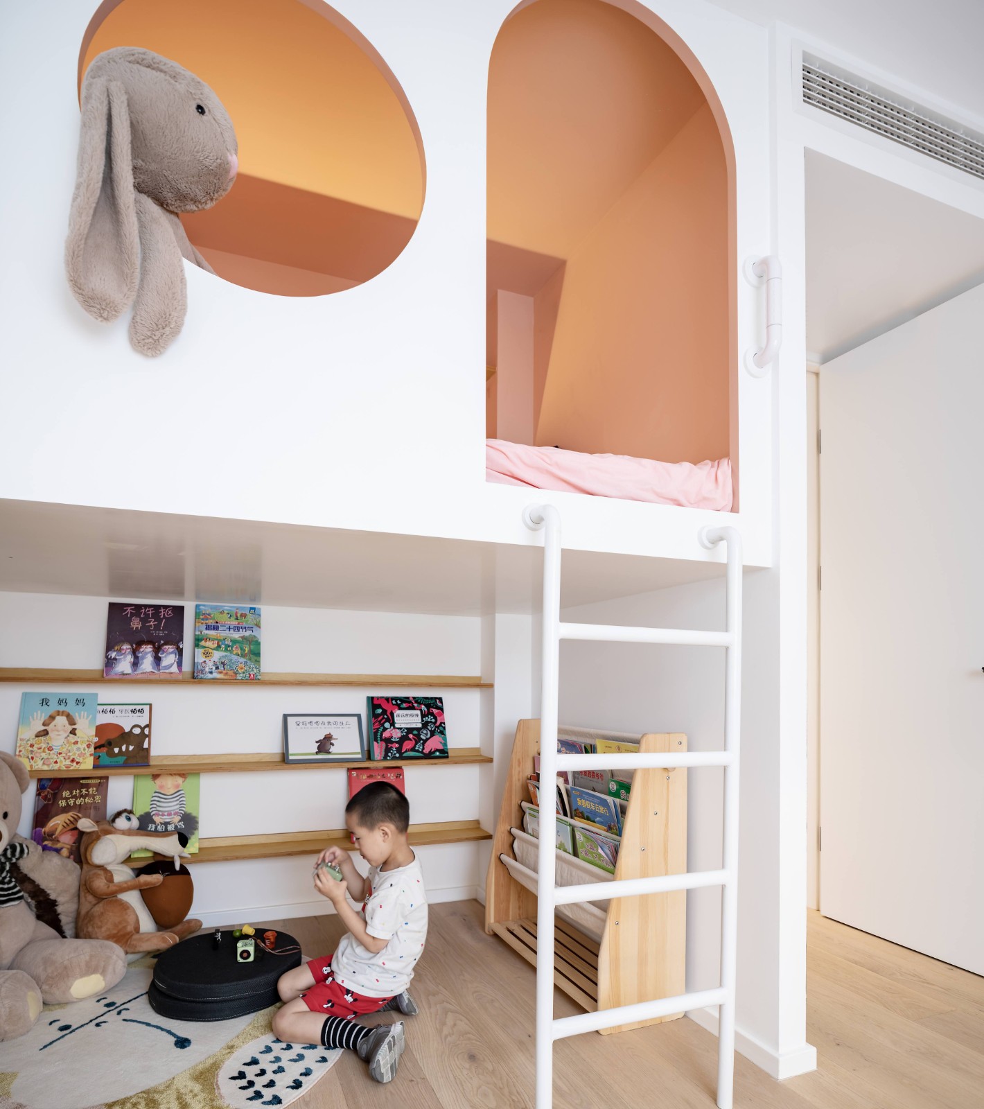 相对有限的空间里,希望把面积***化留给孩子活动,因此将床设置在空间上半部分,下半部分则留给孩子阅读、娱乐、玩耍。角落虽小,却足够他做很多喜欢的、想做的事,超长书桌可以是学习台也可以是快乐游戏的地方。