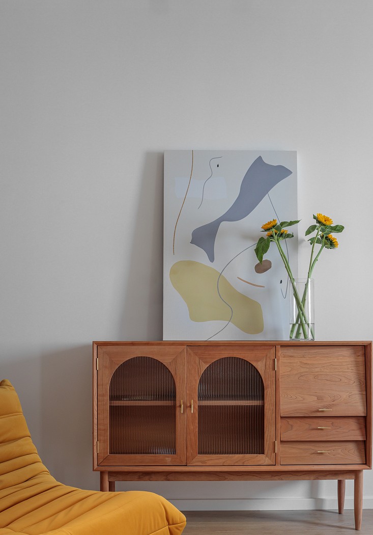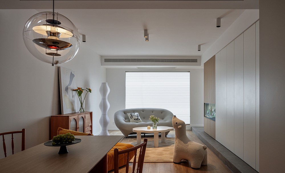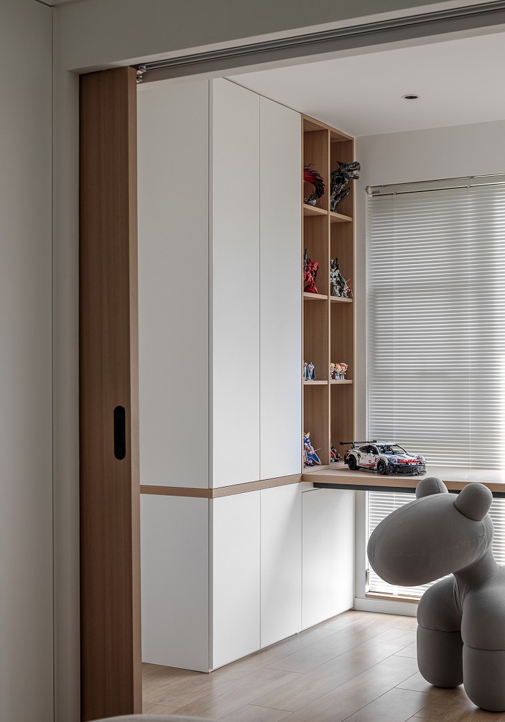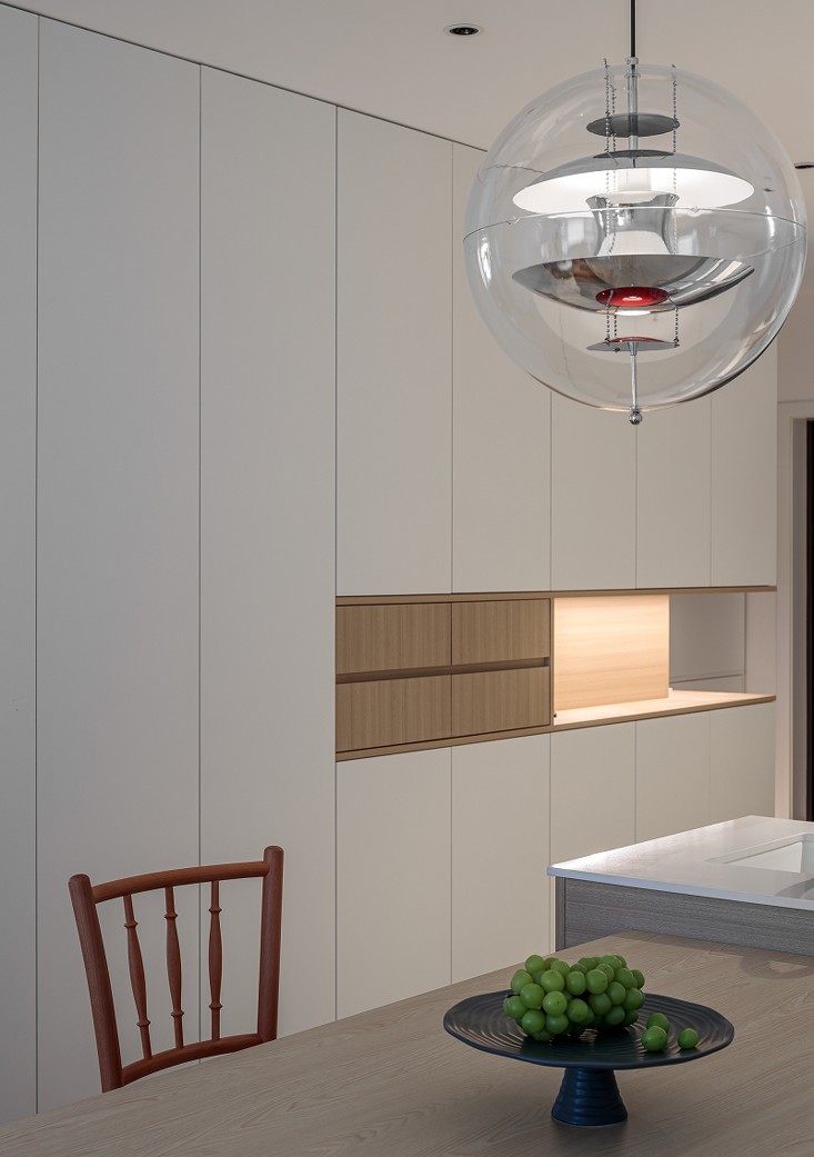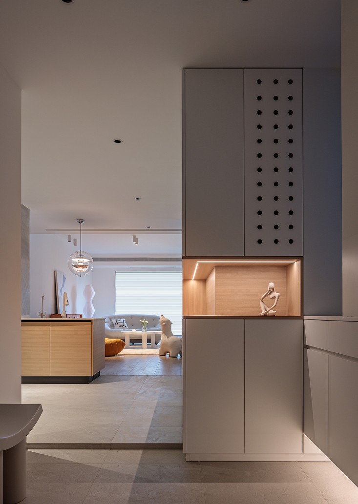 柜体局部运用温暖的木色与大面积白色形成对比,空间更显包容与张力。