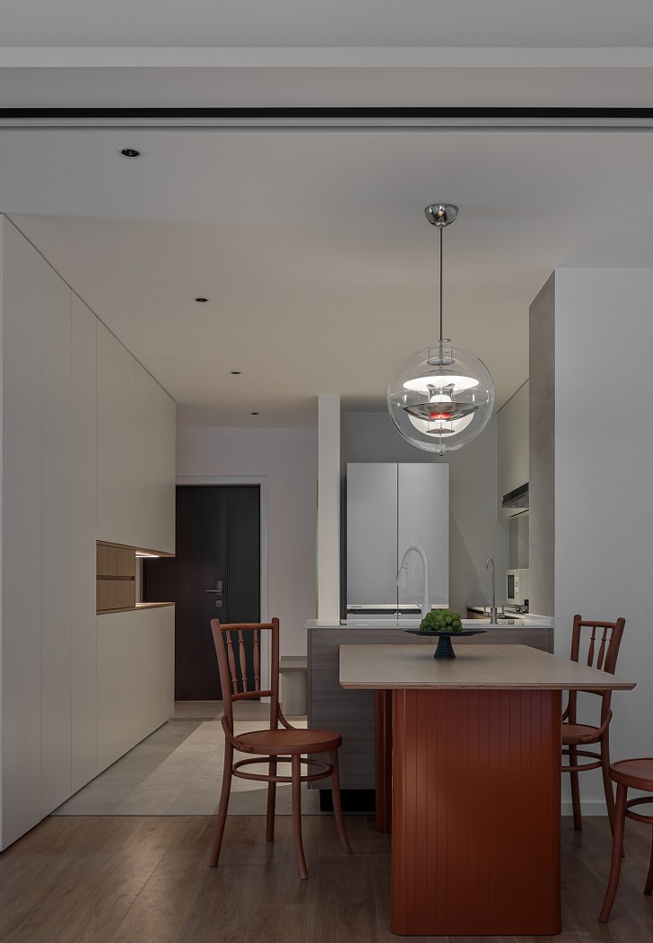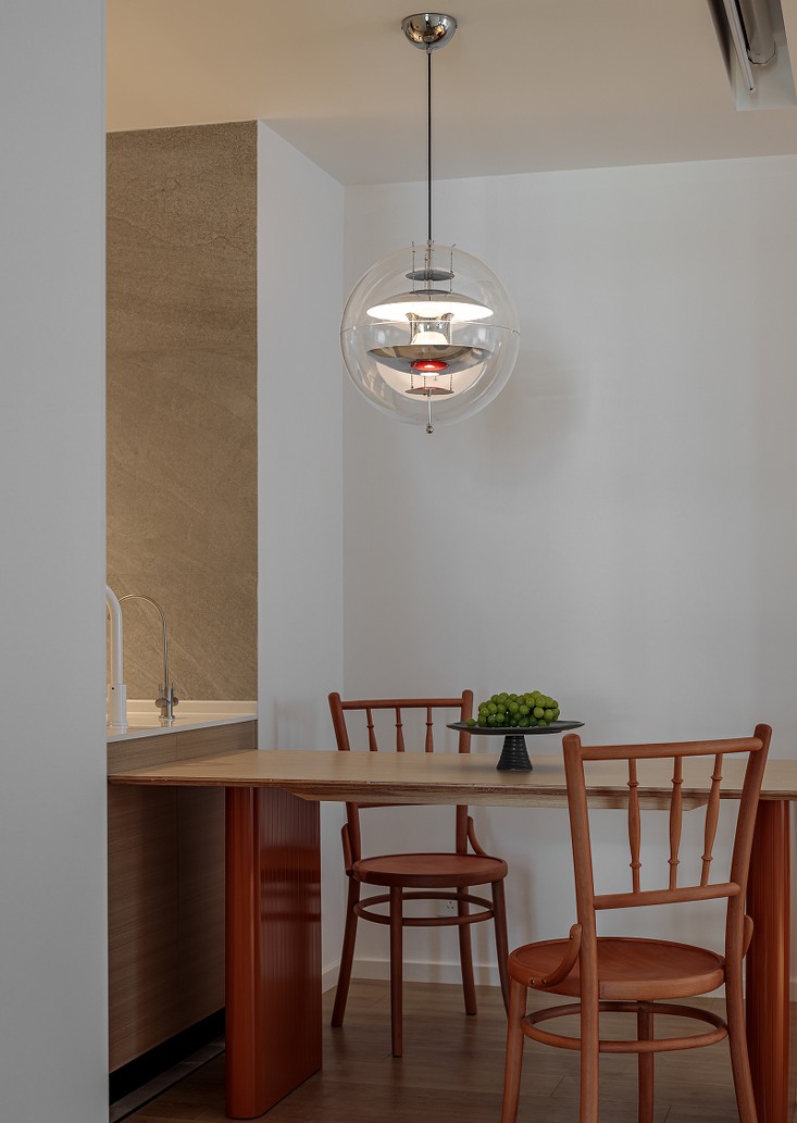 餐厅与厨房岛台相联结,为客餐厅空间省下不小的面积,选择桌腿有一定厚度但简易造型的餐桌,以保证视觉平衡和结构稳定。