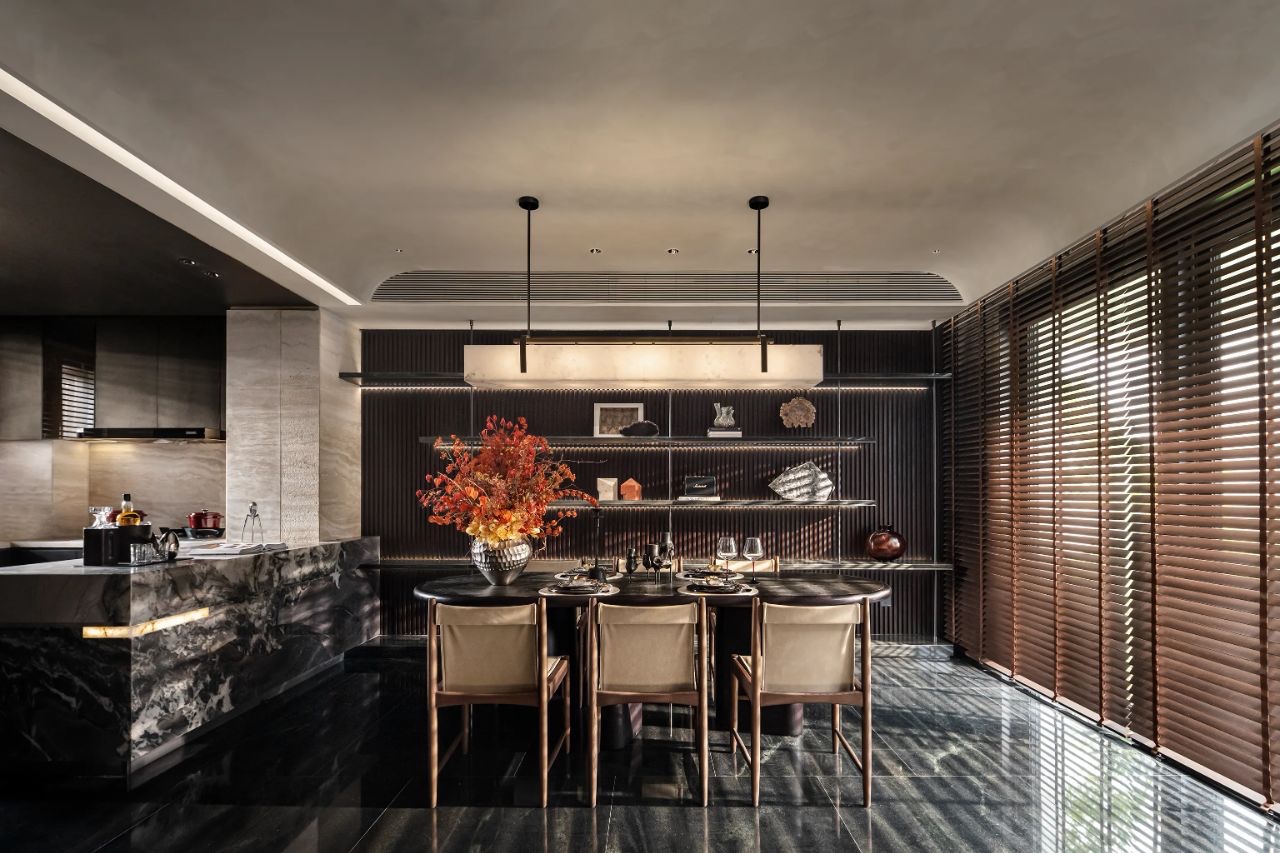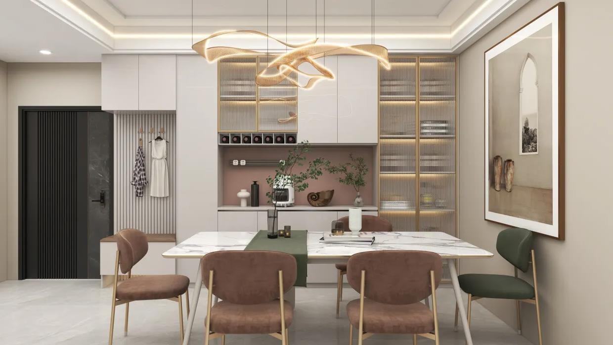 餐区搭配金色金属质感吊灯,餐边柜玻璃门.