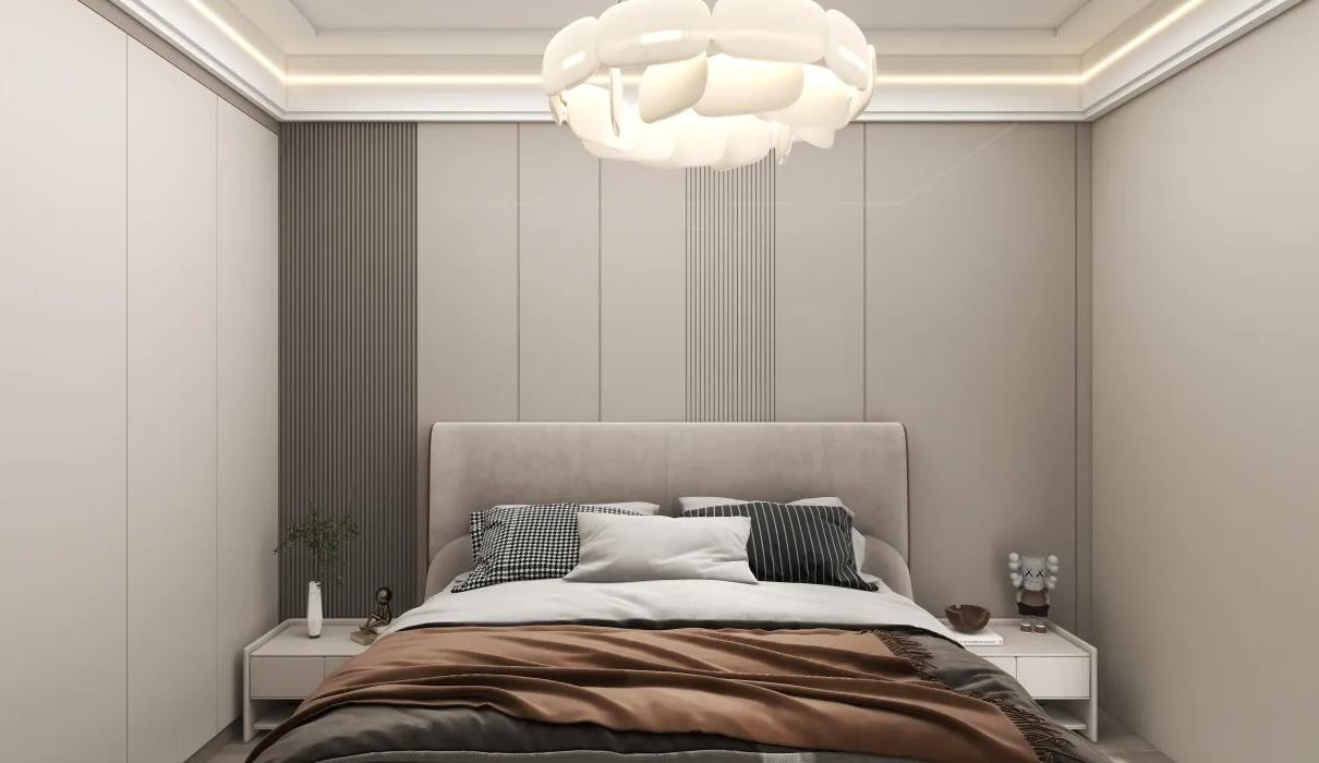 主卧床头背景墙与定制衣柜浑然一体,简洁大气.