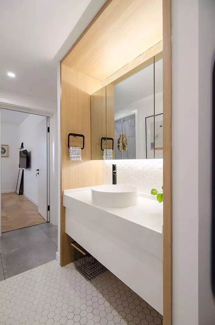 卫生间的洗手台是被放在了门外,利用室内的一个柱子来设计洗手台空间,镜柜搭配藏光的设计也让洗手台区域看起来宽敞明亮了不少。