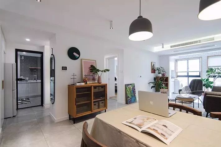 客厅位于餐厅的侧方,墙面都选择了留白的设计,搭配简洁的装饰画、浅灰色的布艺沙发、绿植和落地灯等,营造出一种简约文艺的感觉。