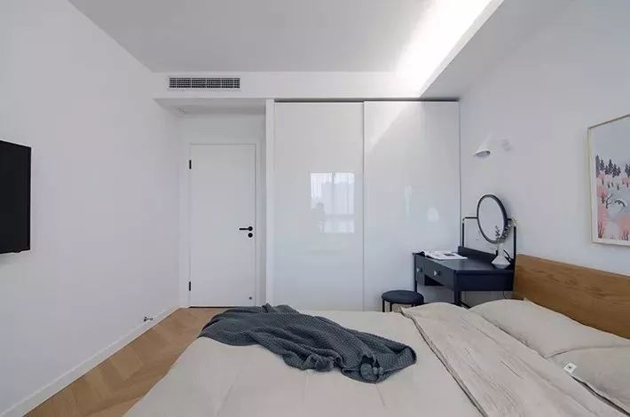 用吊顶内藏光的设计和吊灯、壁灯来代替主灯,让人感觉更加简洁。利用卧室的一侧床头来布置一个书桌、梳妆台,更方便屋主日常使用