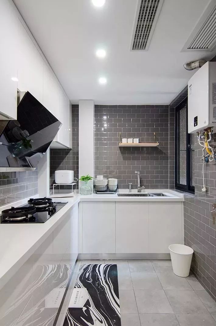 厨房内部是L形的橱柜布局,卫生间的热水器摆放在了厨房的墙面上,也方便厨房能够更快导入热水,灰色搭配白色的设计显得年轻大方。