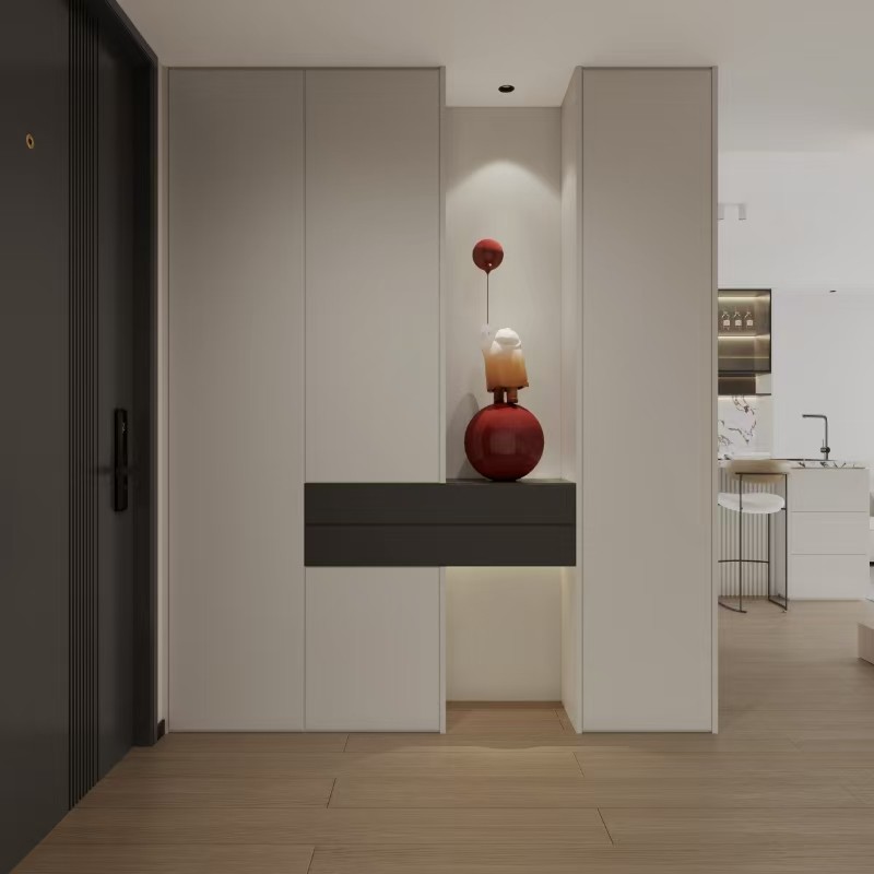 简洁柜体围合出一方玄关天地,红与白的艺术摆件作点睛之笔,在光影流淌间,以极简之姿,开启家的雅致序章 。