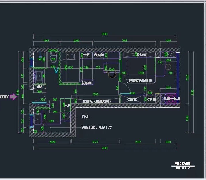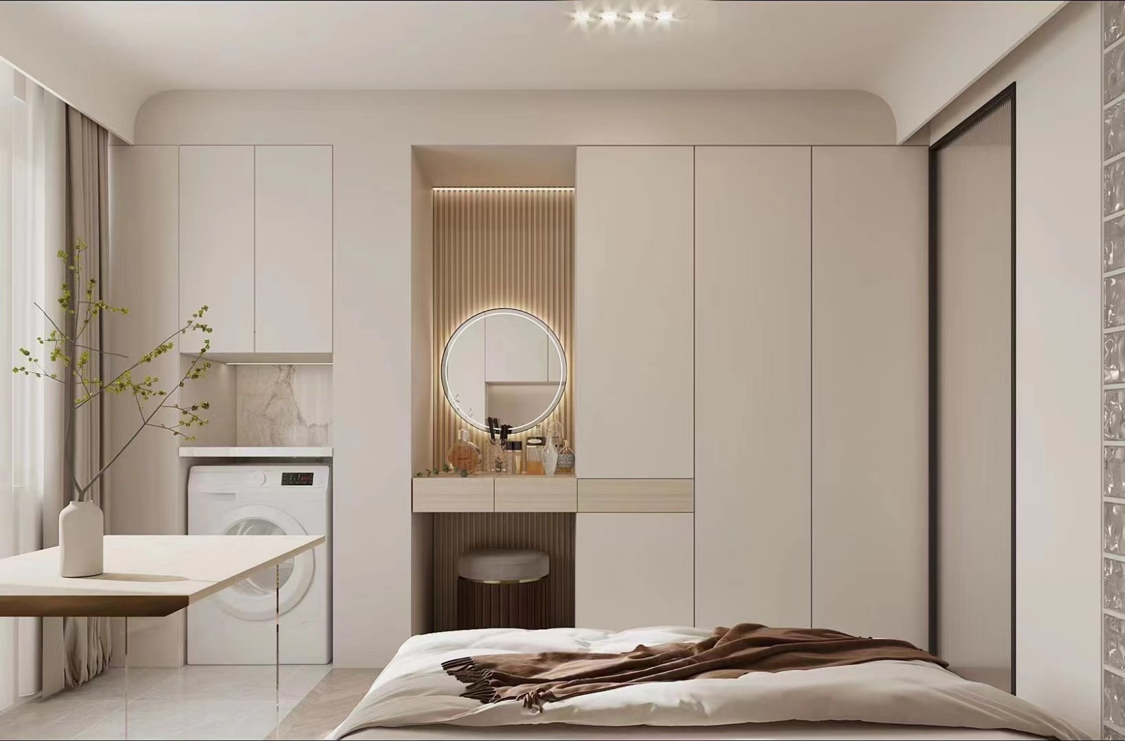 柜体整合洗衣区、梳妆台,圆形镜+灯带精致,书桌简洁,浅色调让小空间显开阔有序。