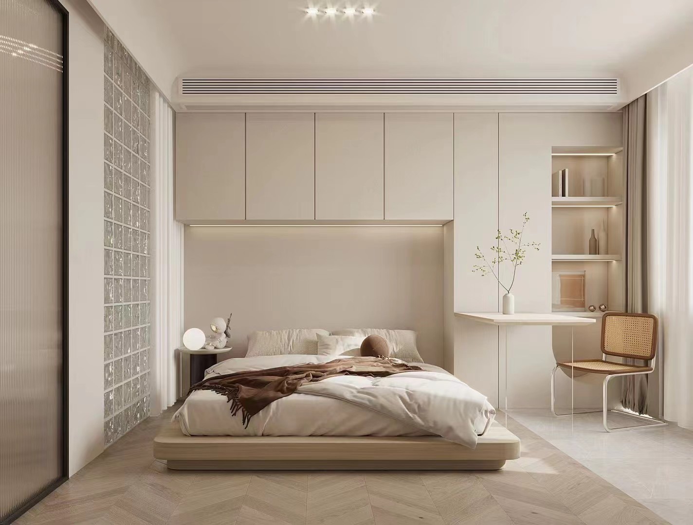 一体化柜体收纳强,玻璃砖隔断引光,书桌、休闲椅嵌入,浅米调营造静谧休憩空间。