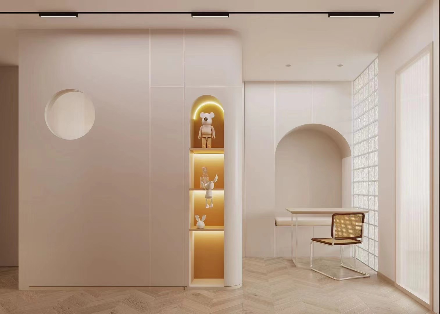 弧形与圆形镂空设计,展示架藏灯带,连通书桌区,浅色调+玻璃砖,空间轻盈开阔。