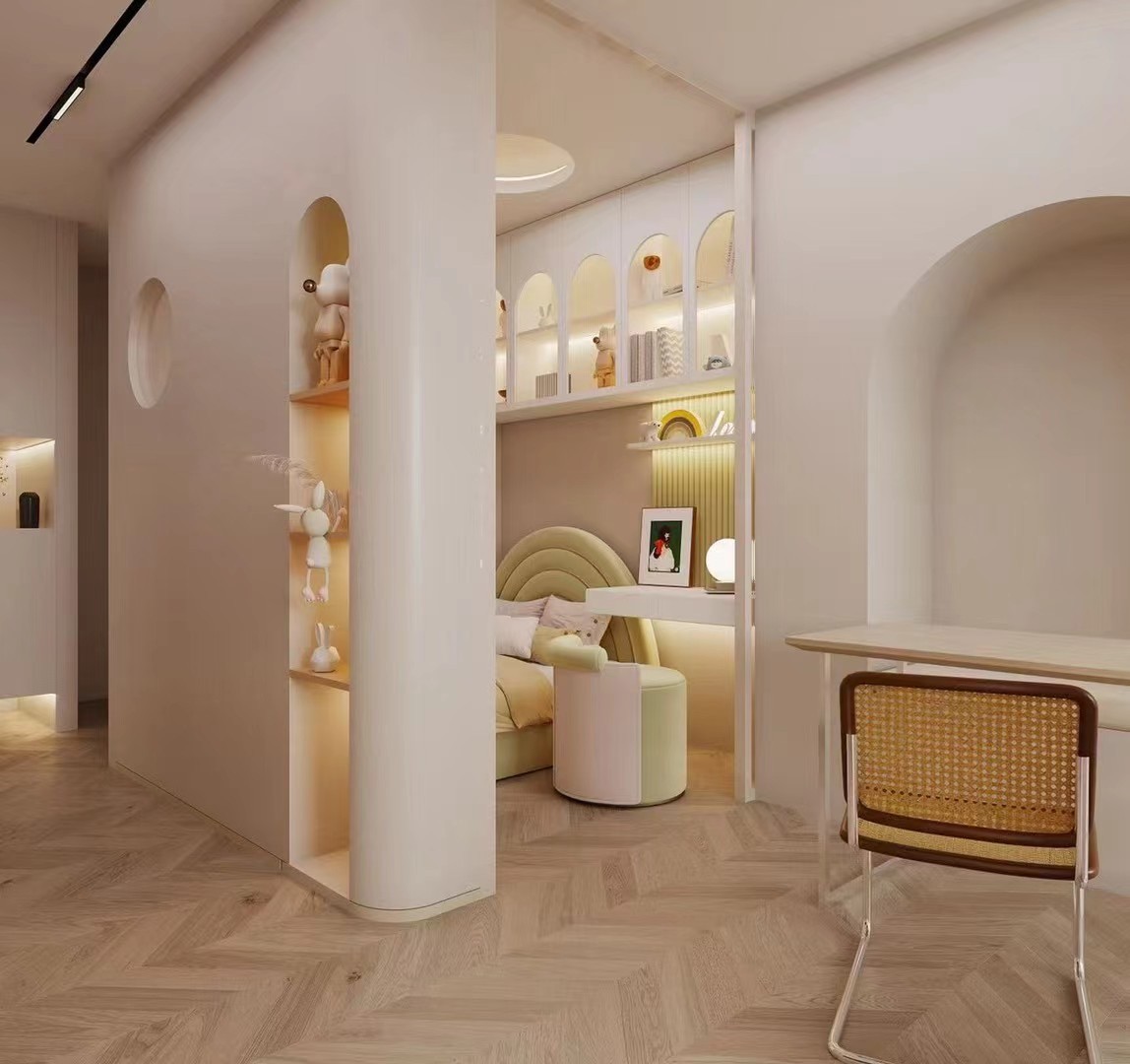 弧形隔断巧分区,嵌入展示架,床具圆润可爱,搭配书桌,柔和色调营造童趣温馨氛围。