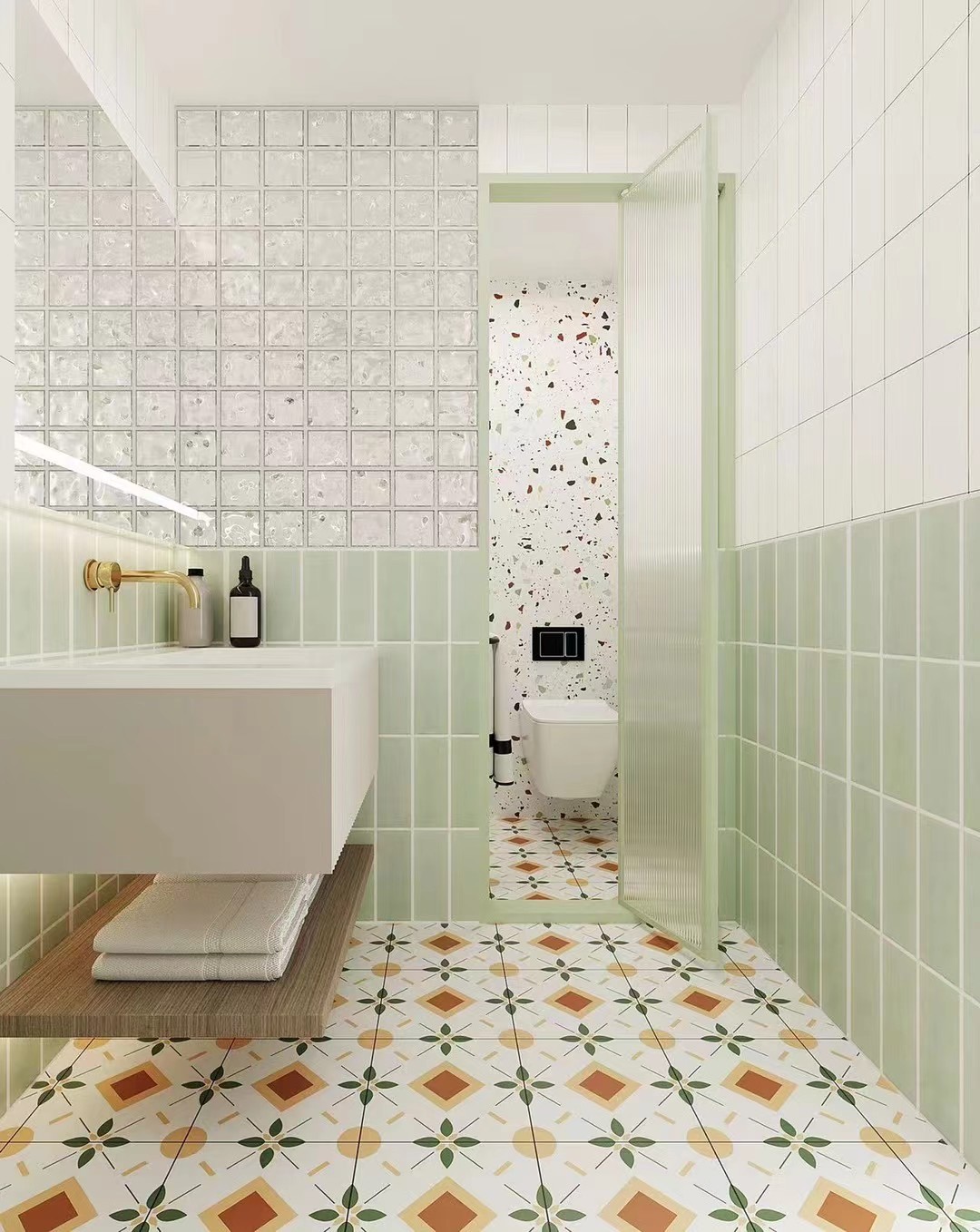 玻璃砖、彩色花砖混搭,分区清晰,绿植点缀,清新又具复古趣味,空间灵动有活力。