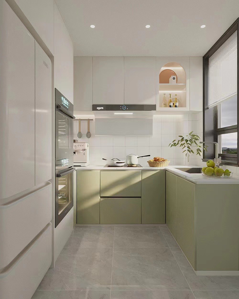 U型布局,白绿配色清新,嵌入烤箱、咖啡机,弧形壁龛添细节,功能与颜值兼顾。