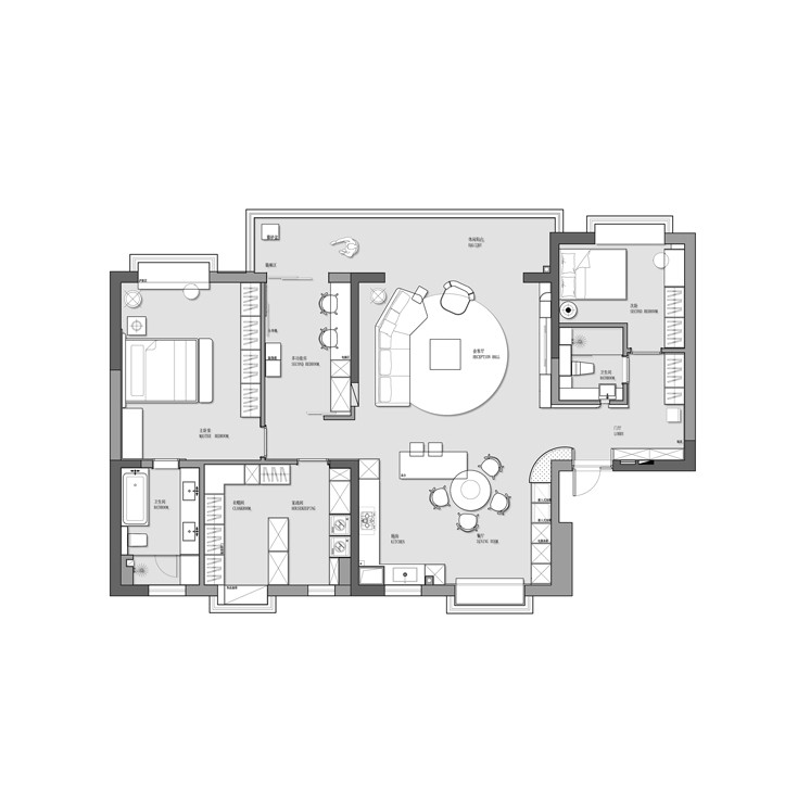 餐客厨完全打开,并连接阳台,中间由衣帽间、家政间和多功能书房过渡,最里到达卧室,将飘窗改造为小象的梳妆台,充分照顾到了一家人的生活、工作、爱好、玩乐等场景。