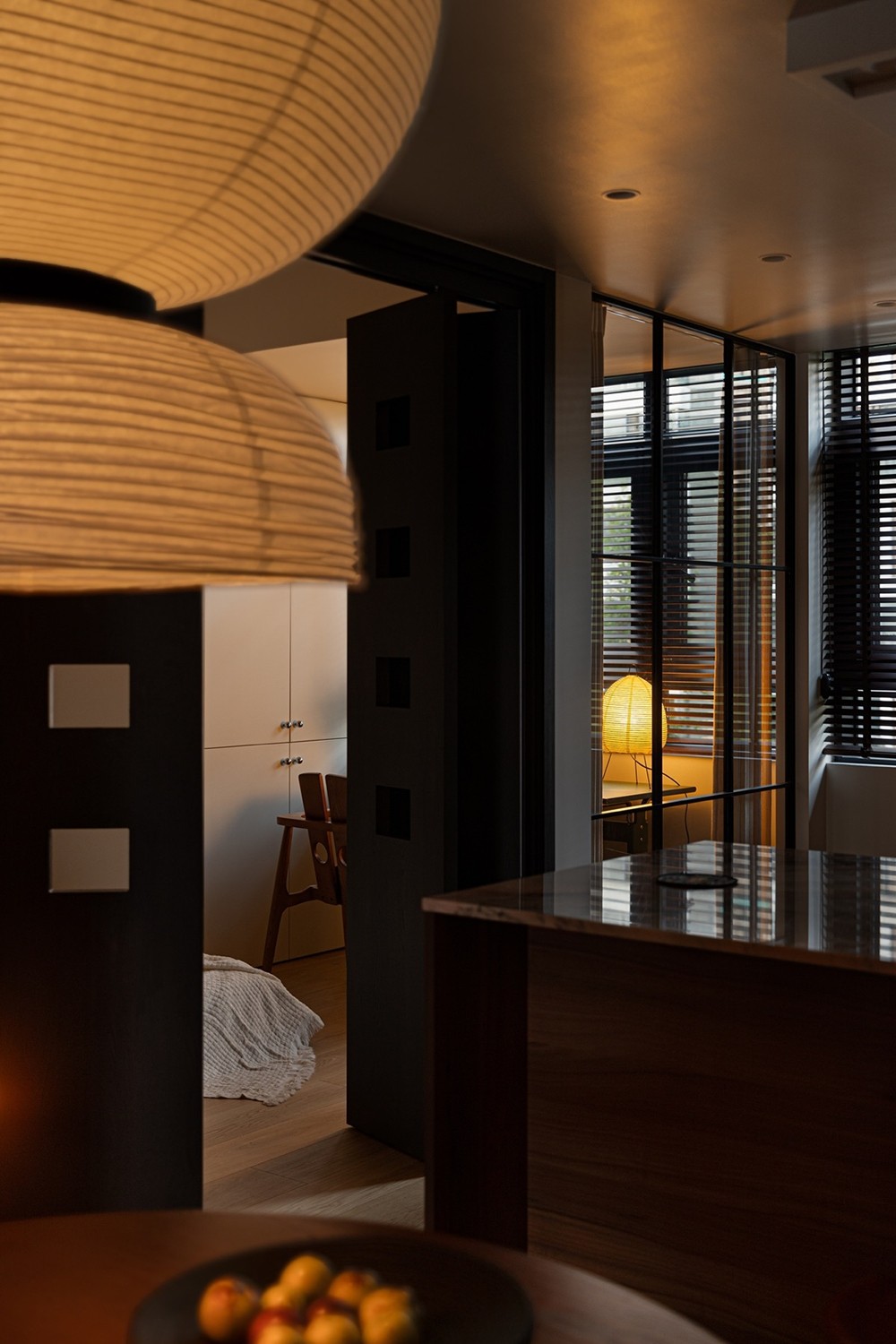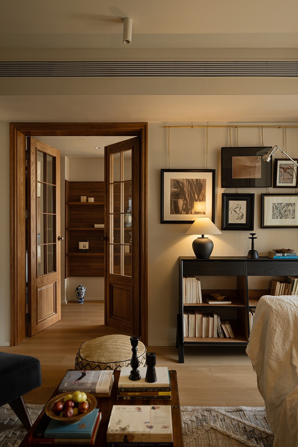 靠墙的一侧布置了储物柜、书柜与茶水桌,深色木调统一了视觉秩序,也延展了空间的厚度。