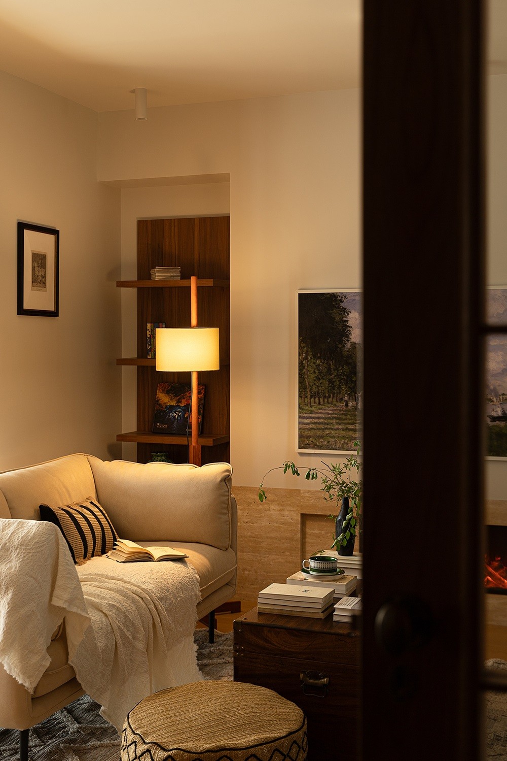 客厅的设计透露出多元文化的审美趣味。壁炉、非洲鼓坐垫、木质茶几,这些元素在同一空间内并置,却丝毫不显突兀。它们像时间的印记,连接起屋主的生活记忆与审美偏好,让空间充满故事感。