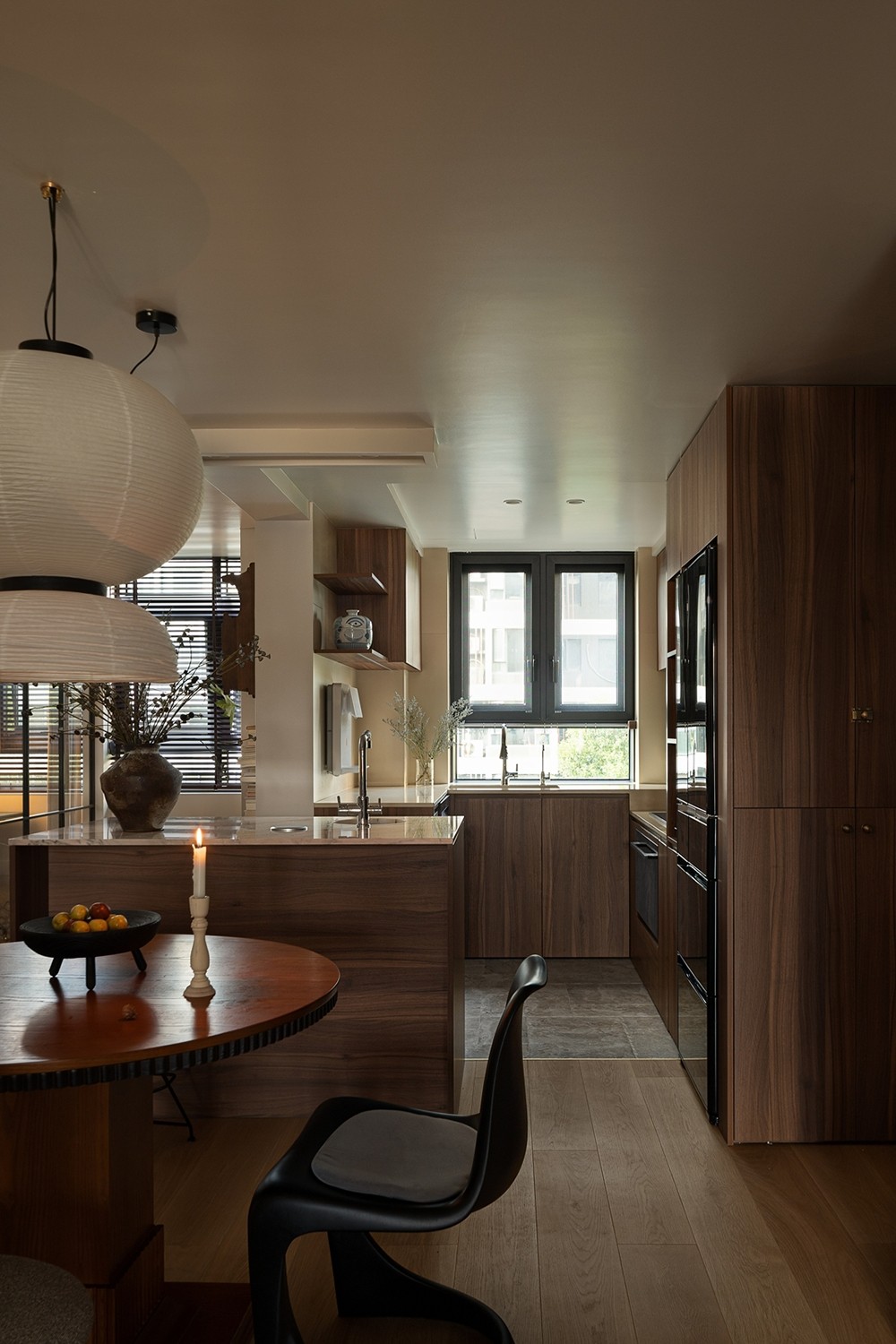 厨房采用半开放式结构,胡桃木与暖白色墙面形成温和的对话。