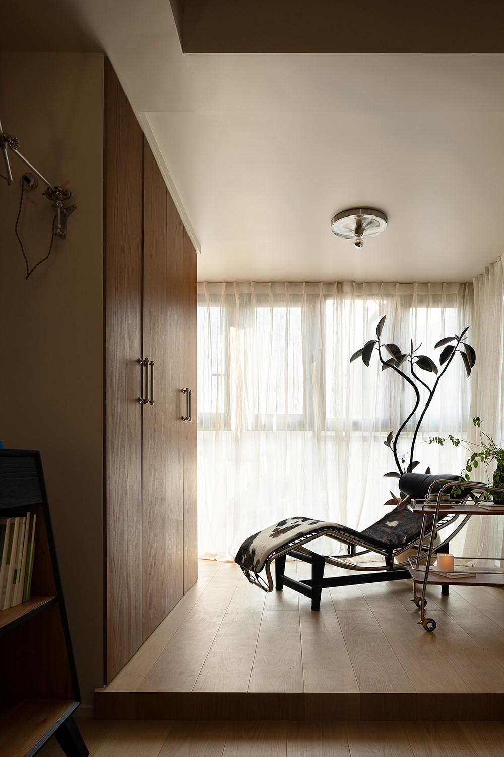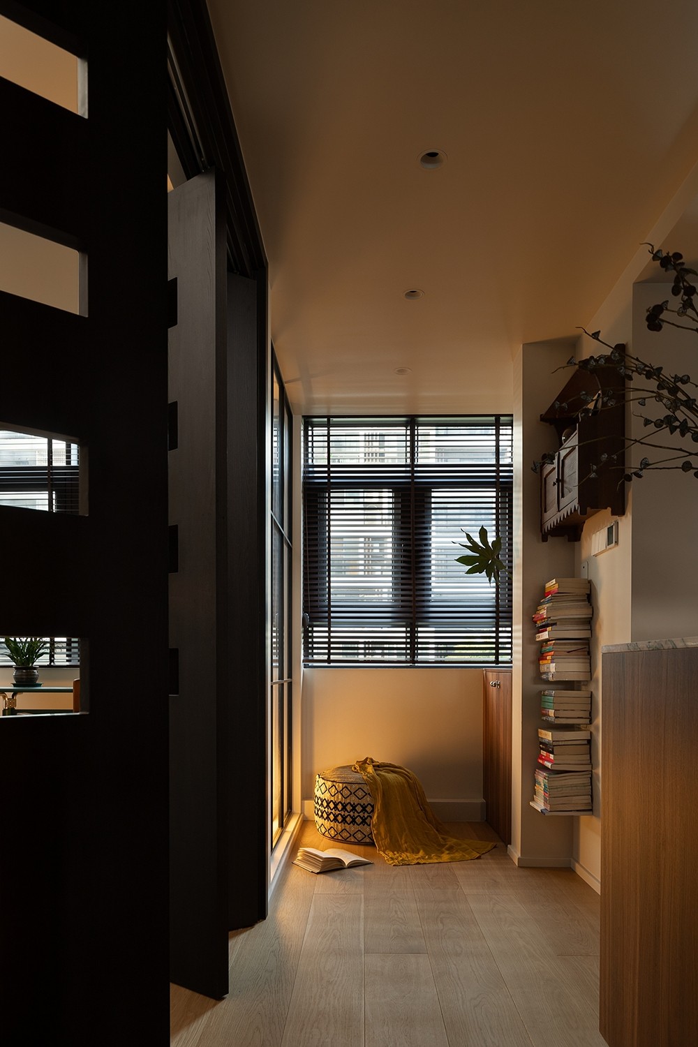 阳台被纳入室内后,设置储物柜与单人沙发,成为屋主放松、阅读、品茶的私密角落,生活的仪式感在此悄然延伸。