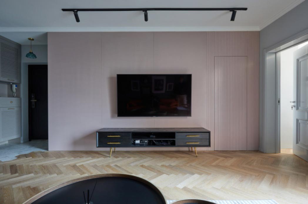 因为房屋结构问题,无法改变卫生间的位置,于是设计师尽可能在视觉上去做优化,做法是统一整个电视背景墙,有意弱化卫生间的门,通过竖线条弱化门缝使其变成一道隐形门,而烟粉色给人一种放松且舒压的感觉。