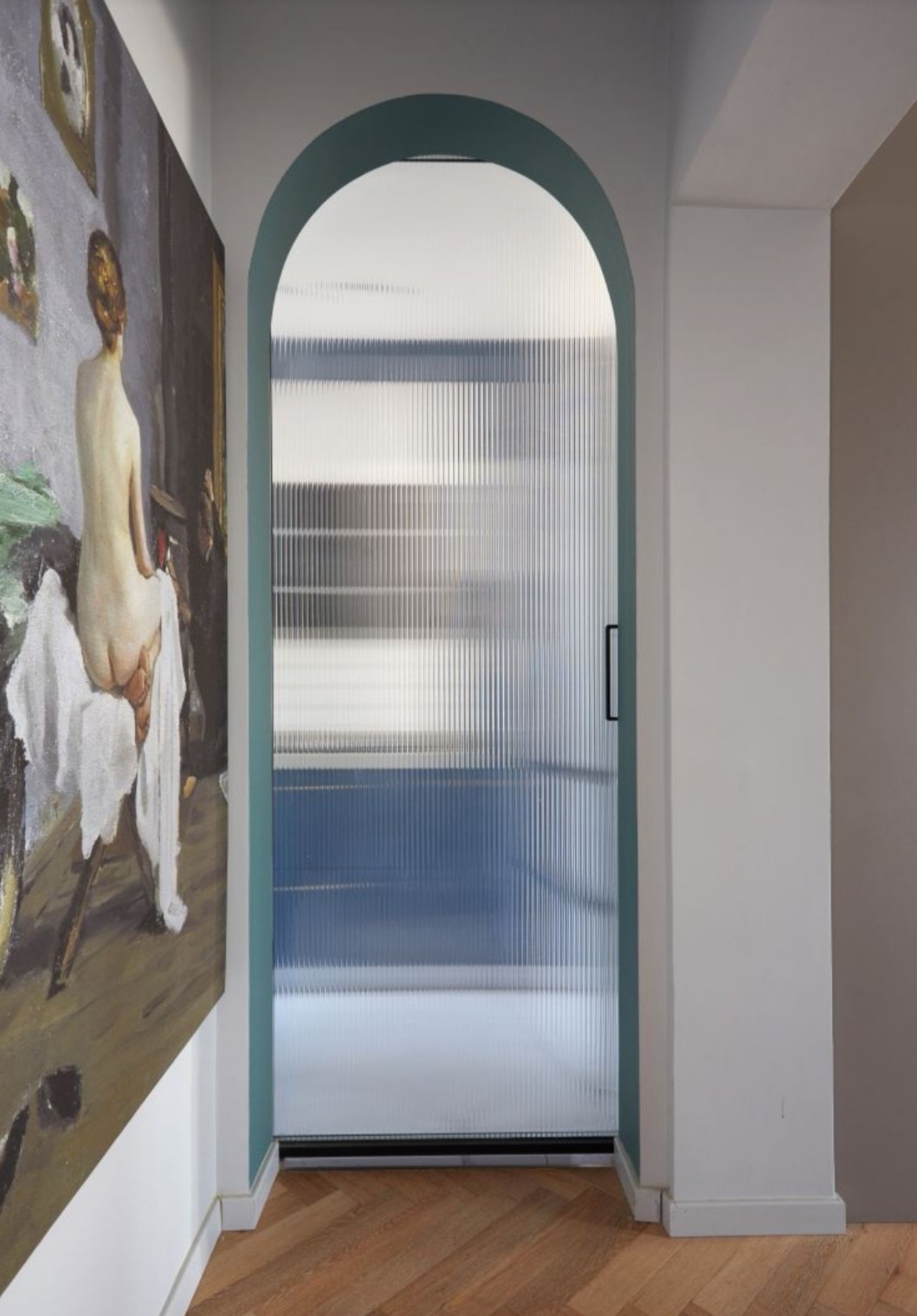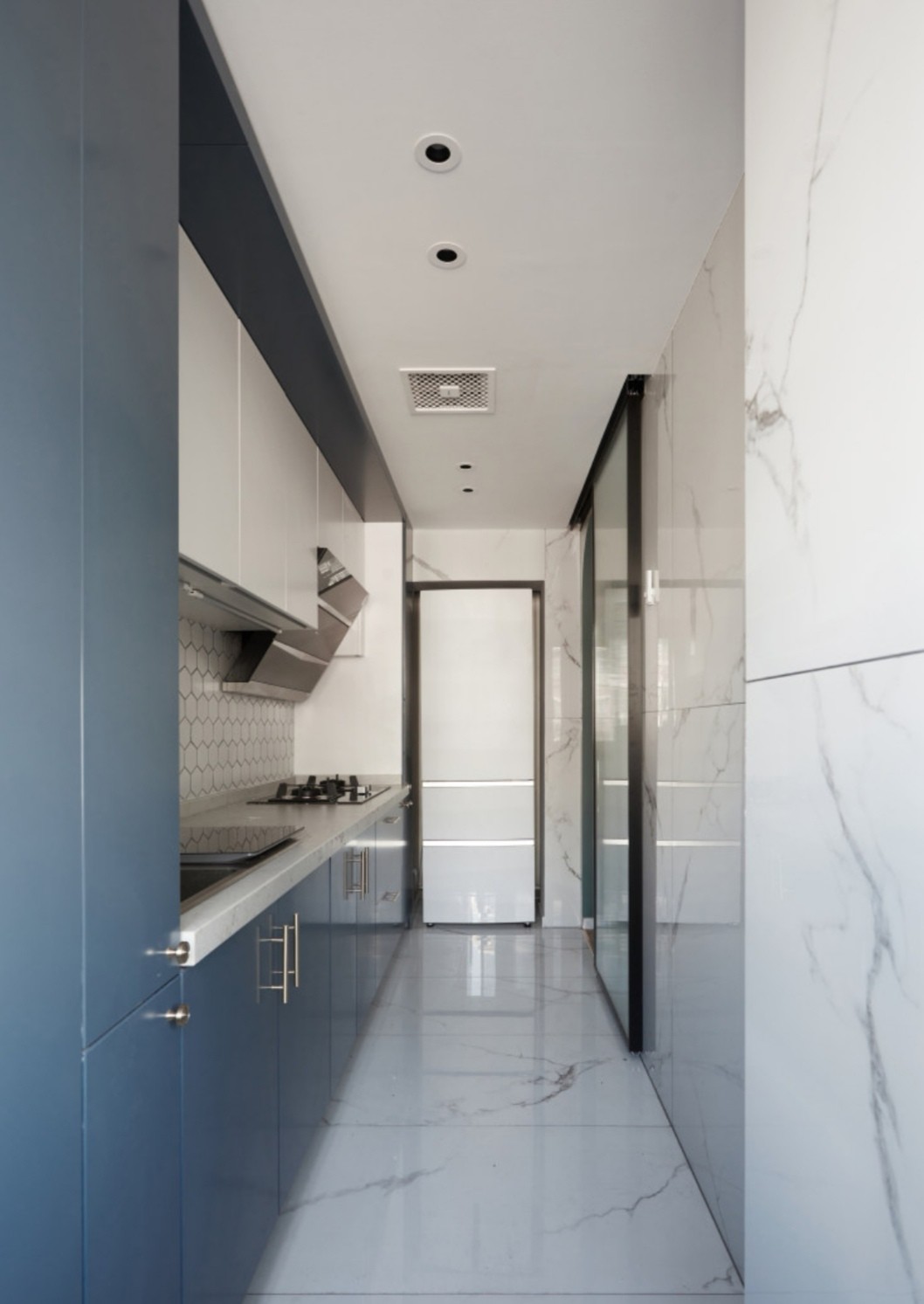 厨房的拱形门和挂画,包括和整个空间的整体氛围,都形成一个完整的呼应,门洞里那一抹松绿色让人联想到了遥远的爱琴海,而橱柜的颜色是沉静的深蓝色,与之对应的是干净简洁的白色墙砖,和之间凌乱的厨房场景形成鲜明对比。为了节省空间,用了推拉门,关上门时具有朦胧美的长虹玻璃也成为了一道美丽风景。