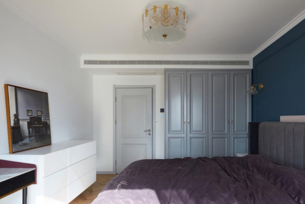 灰色的定制柜和浅灰色的门形成呼应,柜门上同样运用了石膏线元素,让整间屋子多出复古之感。