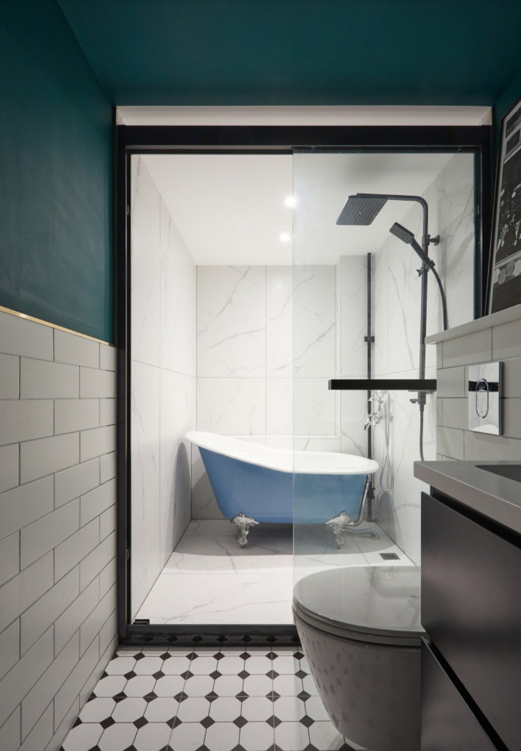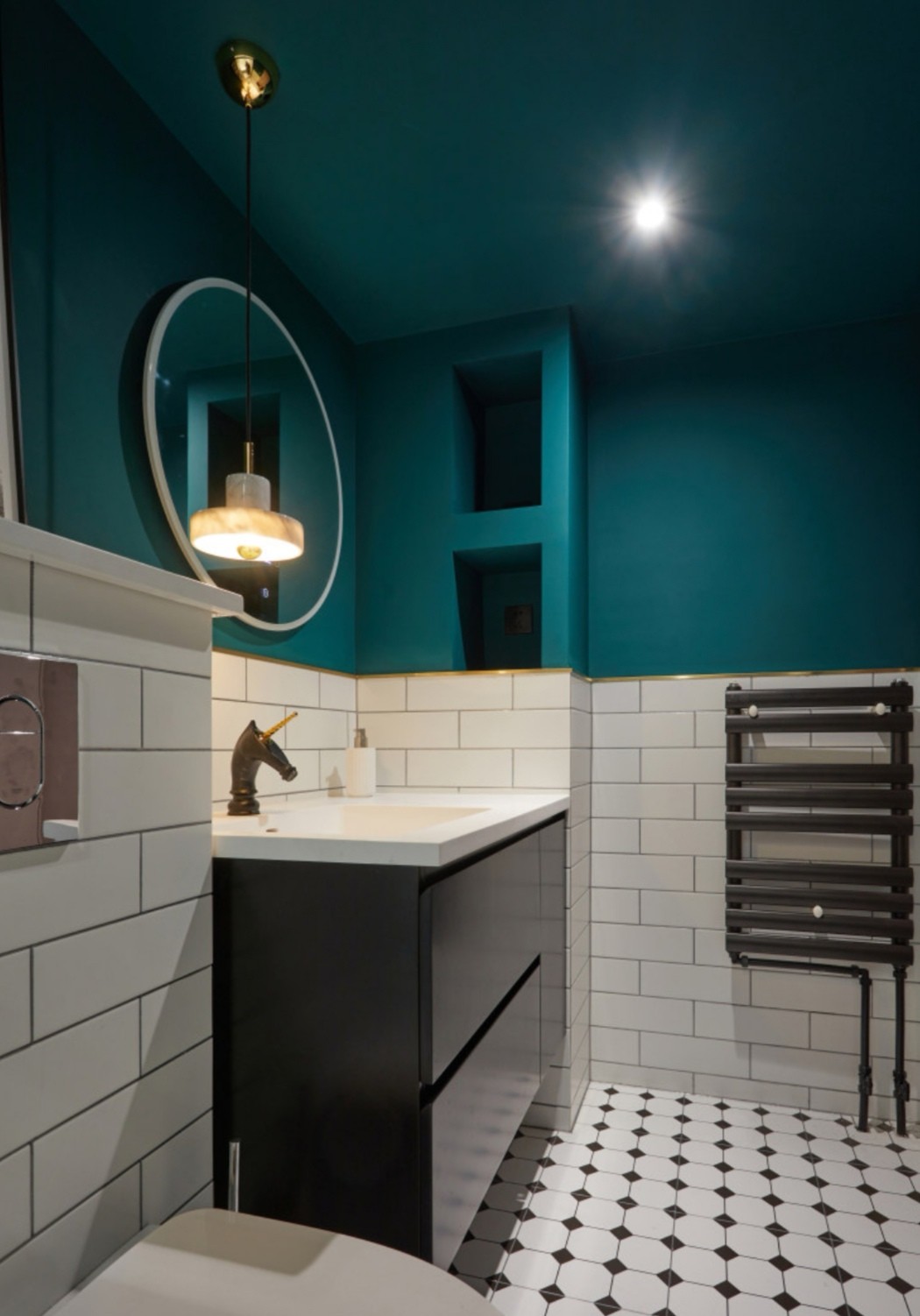墙面半墙贴长条小白砖,另一半是是深绿色防水漆,两者之间以金色不锈钢条做过渡,搭配黑白小地砖烘托出复古且优雅的氛围。为了不留下空间死角、使用方便,用更简洁的壁挂马桶代替了传统马桶。