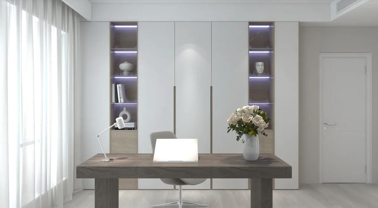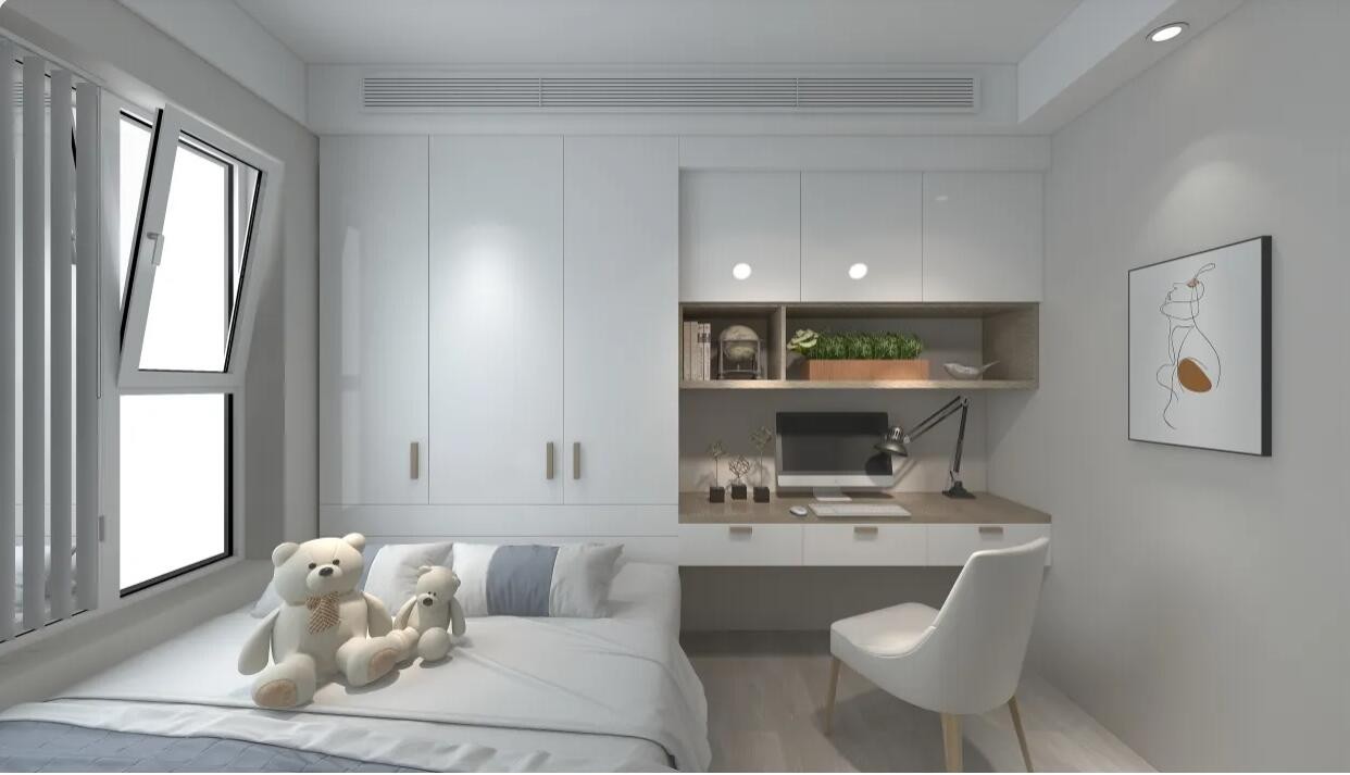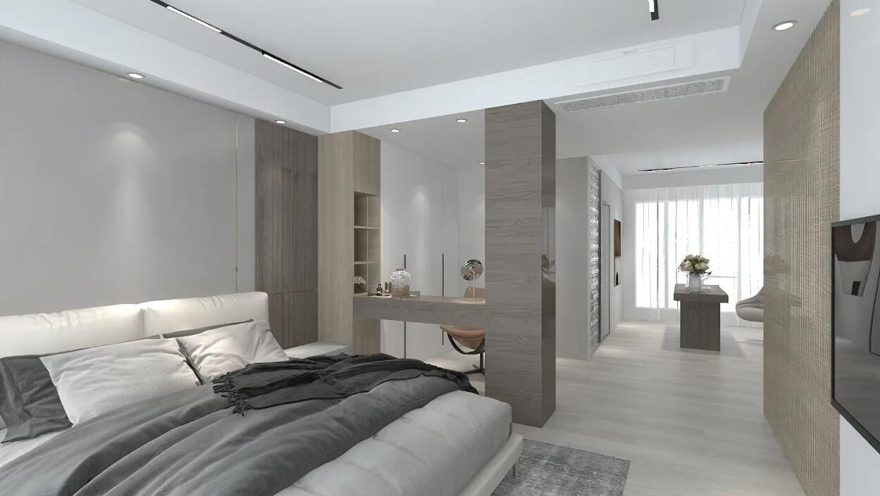 米灰色系主卧空间营造出闹市中的静谧归所,书桌设计巧妙隔出衣帽间,空间利用率大大提升。
