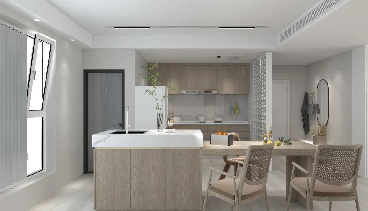 餐厅与开放式厨房结合,整个客餐厅充满着生活气息,莫兰迪色调的木饰面板打造静谧安然之感。
