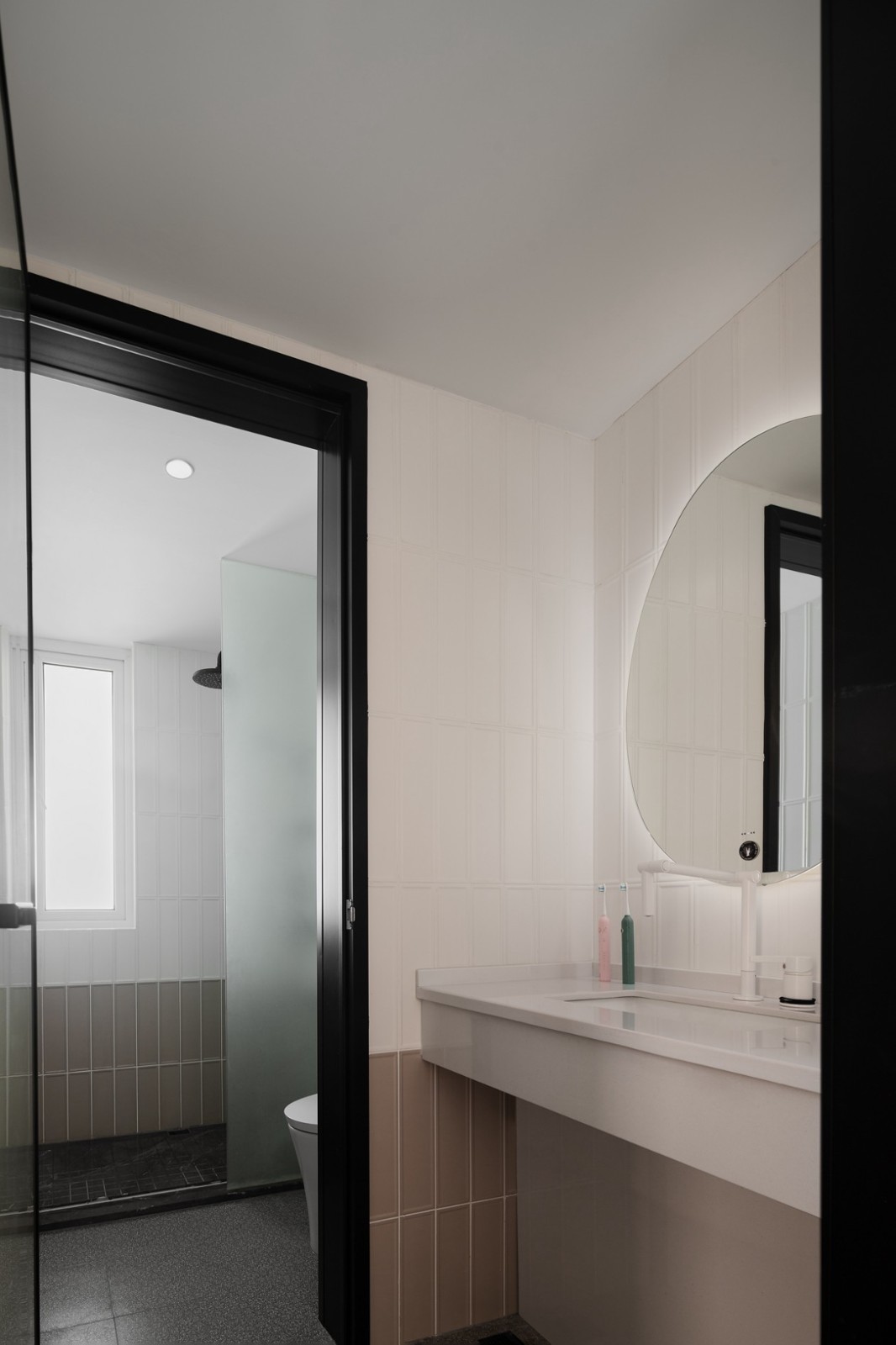 延续整屋的用色风格,一贯的简约设计体现屋主人喜欢素雅简单的审美,卫生间湿区顶面采用防水涂料,空间素净整体感更强