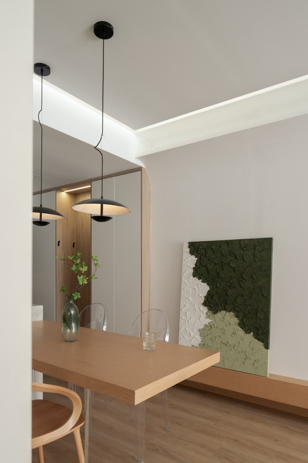 岛台餐桌选用统一的岩板与原木色的材质,也可以作为备餐区来使用,利用亚克力桌脚,使得整个装置更显艺术。 餐边柜的设计让厨房操作区隐藏起来,视觉上让空间更整洁轻松,是瞬间能让人卸下疲惫放松的饮茶,轻松惬意,厨房的主角是纯净的白,整张岩板的墙面