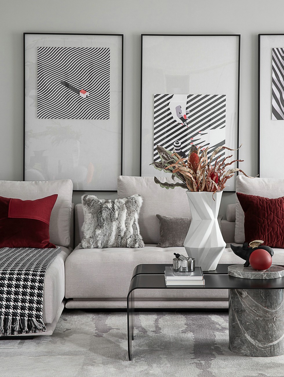 设计师用简洁的视觉效果营造出时尚前卫的家居氛围,用优雅时尚的玛莎拉红搭配各式条纹布样把持全局,使得整体空间显得高雅、活泼、感性。