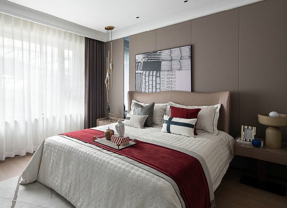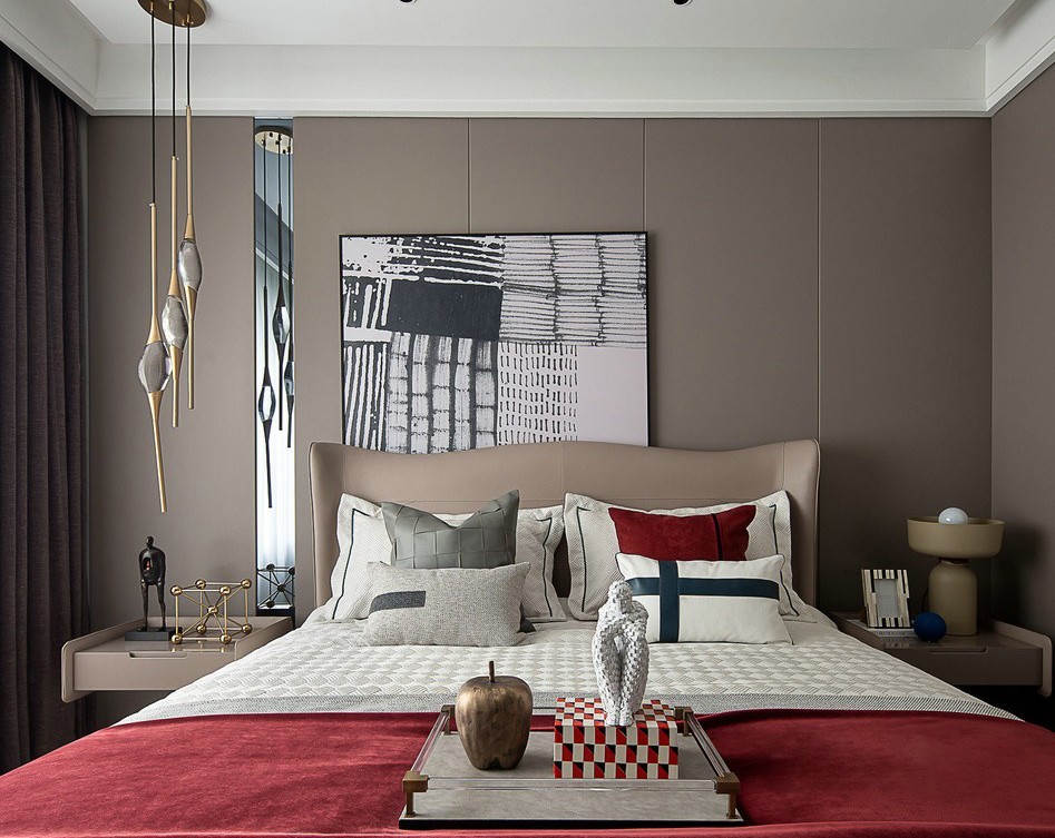 主卧房红色的床品,安逸而舒适地铺陈,似乎在强调空间的睡眠属性。背景的线条感挂画与水晶金属吊灯点亮主线,为空间递增趣味性,平淡中寻不凡。