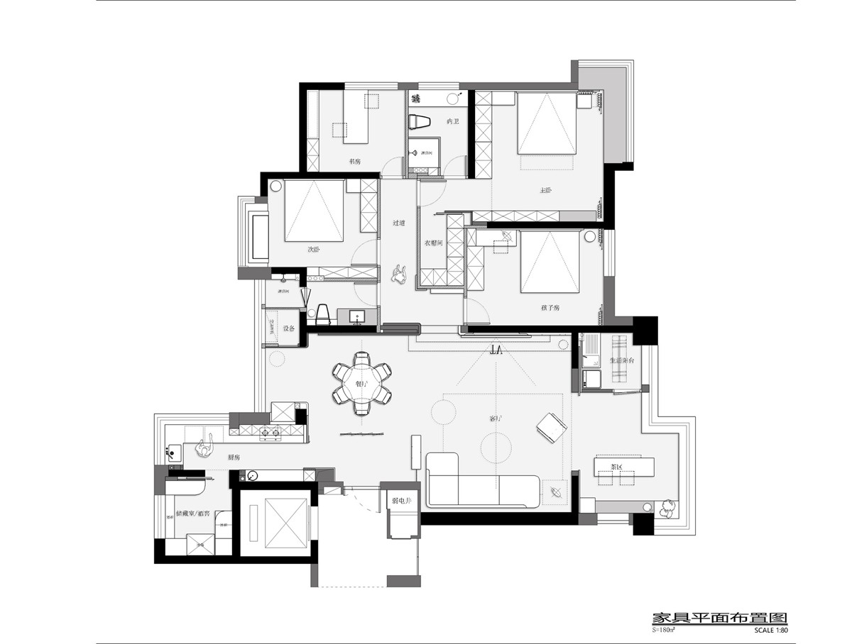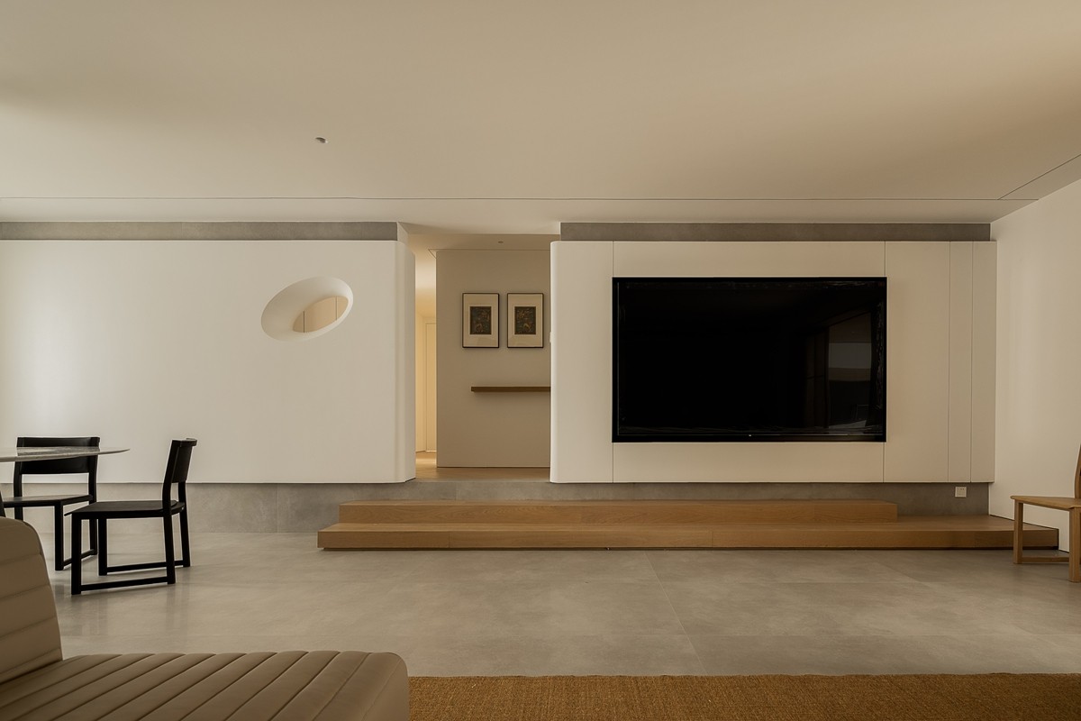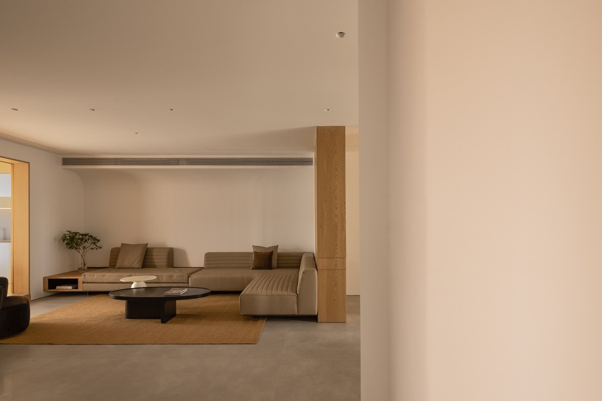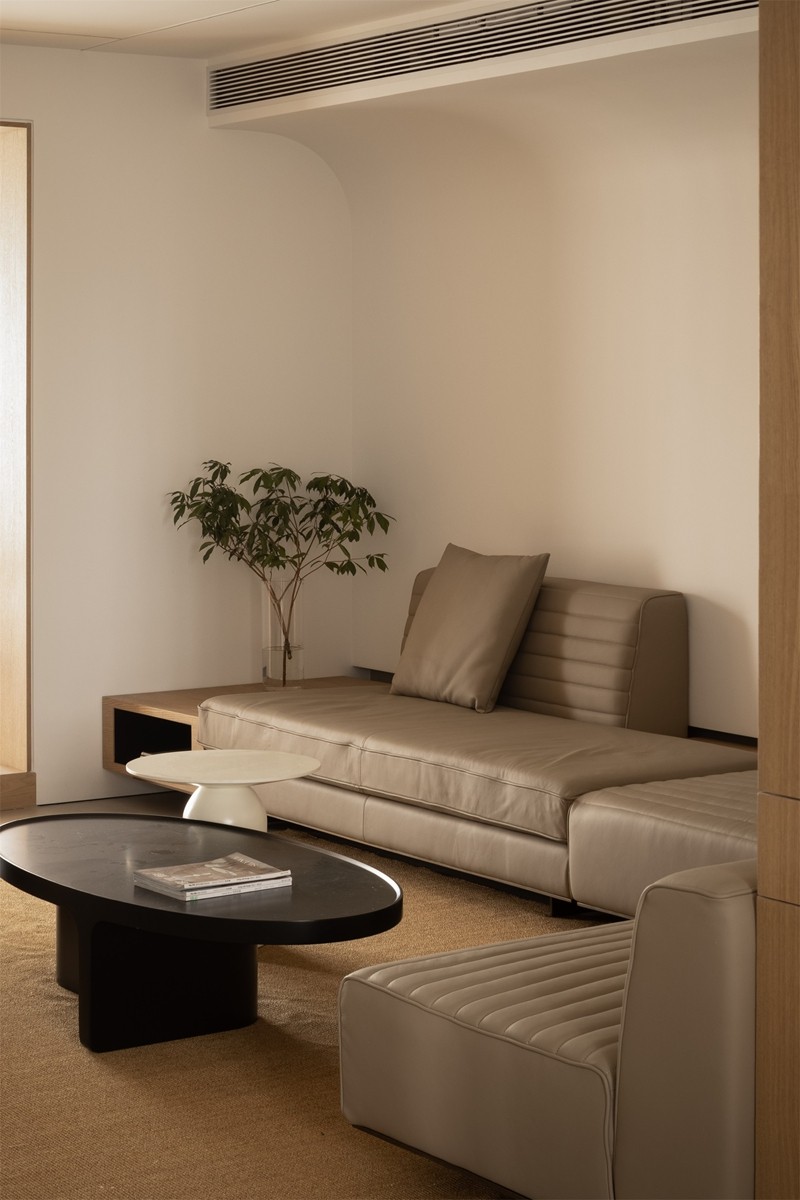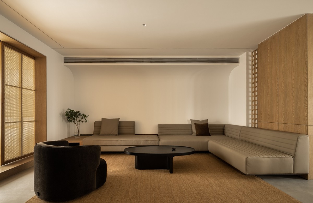 L型浅灰皮革沙发弱化体量感,弧形墙面消解直角的锐利,藤编窗门过滤强光,亚麻地毯界定核心休憩区,黑色圆形茶几以几何对比强化现代感,整体营造“围合却不压抑”的交流氛围。