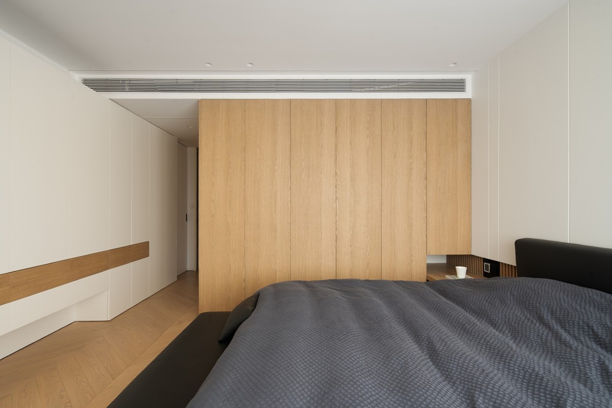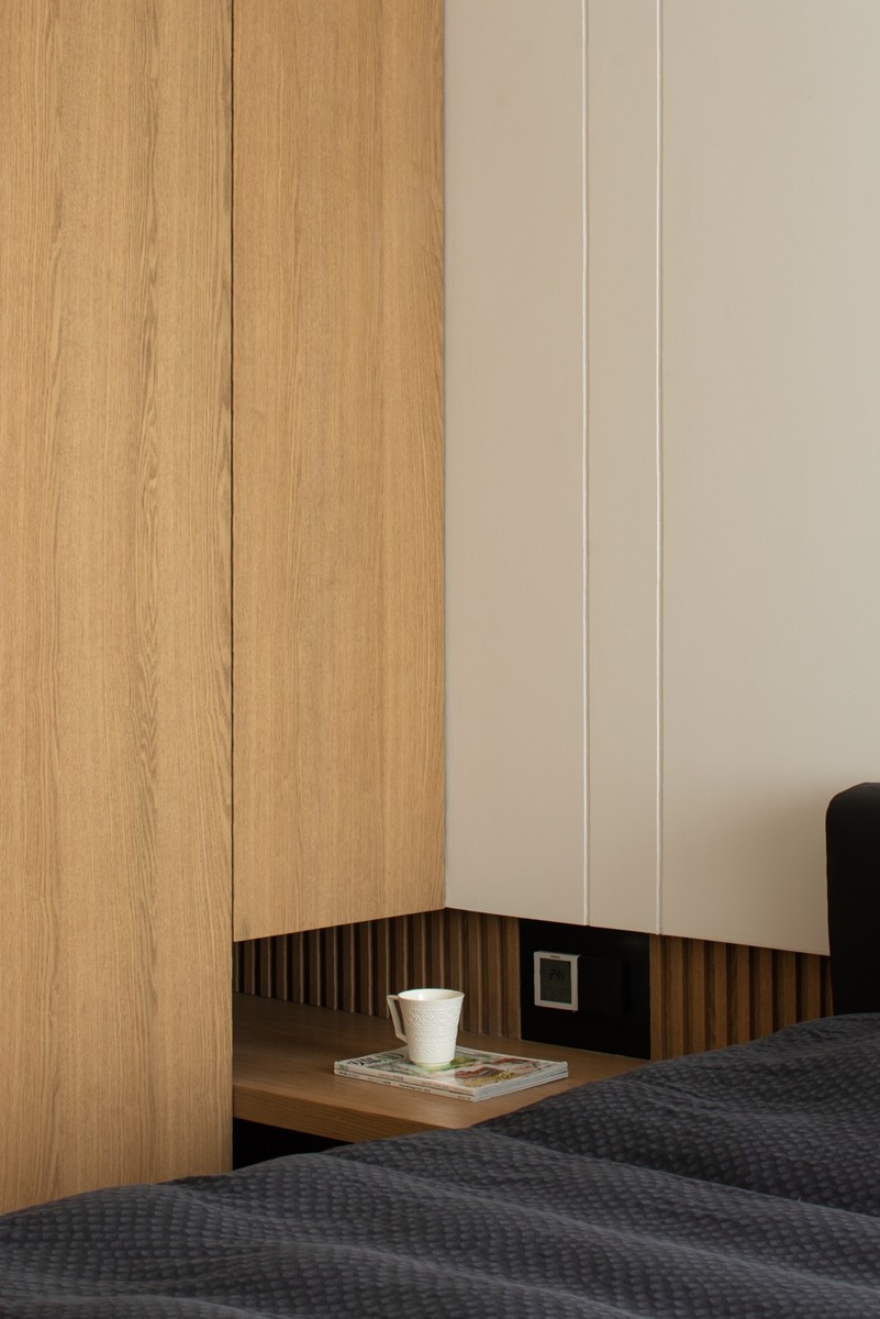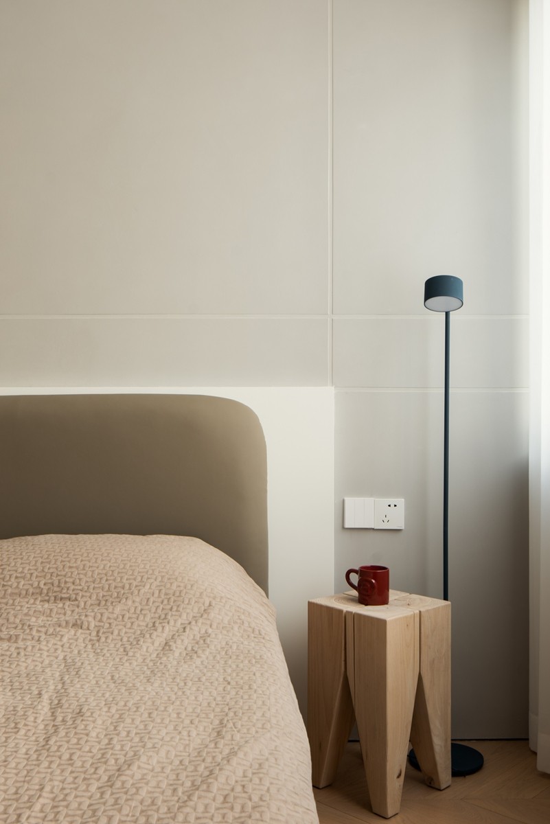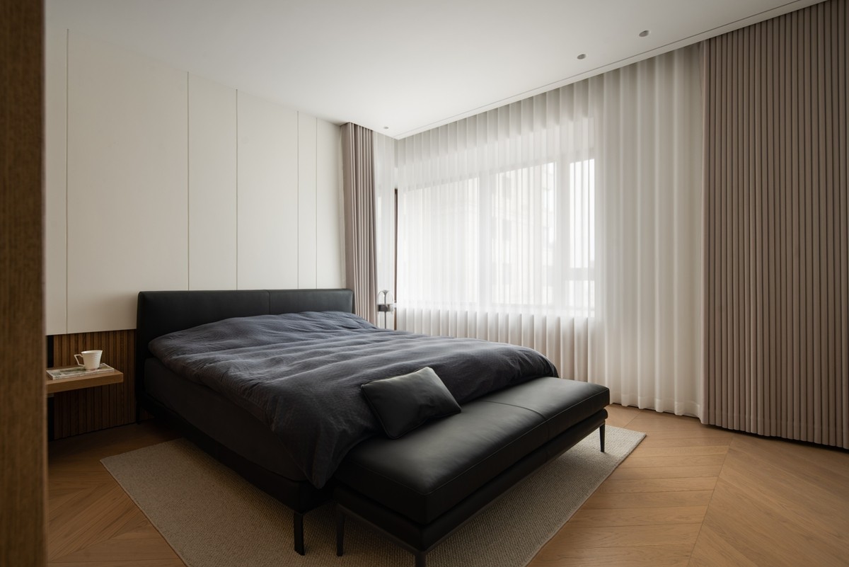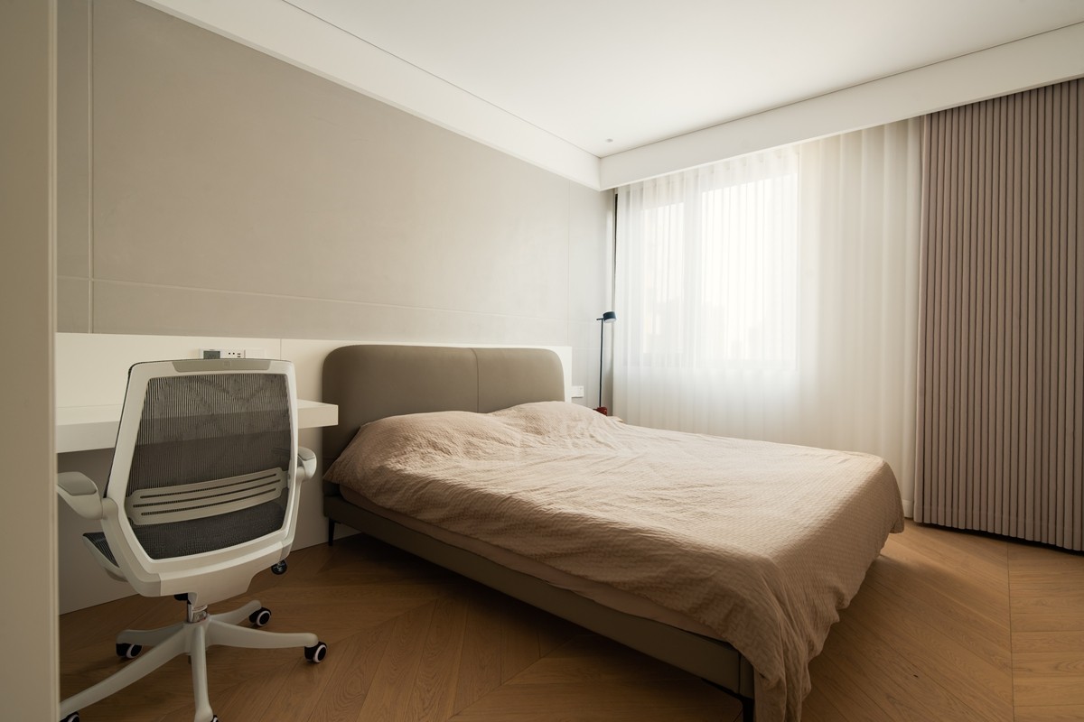 采用“低饱和色彩+极简线条”设计,人字拼木地板延伸空间纵深感,半透窗帘柔化光线,床头背景墙以木饰面与纯色板材拼接,既保留自然质感,又通过简洁造型营造睡眠仪式感;嵌入式书桌与办公椅的组合,让卧室同时承载休憩与轻工作功能。
