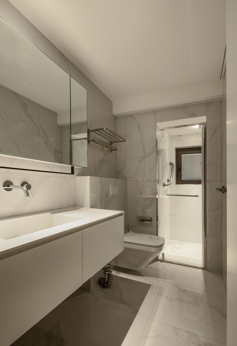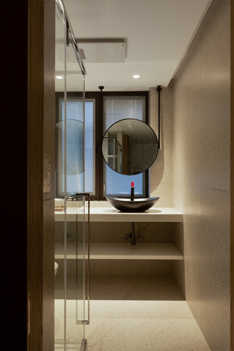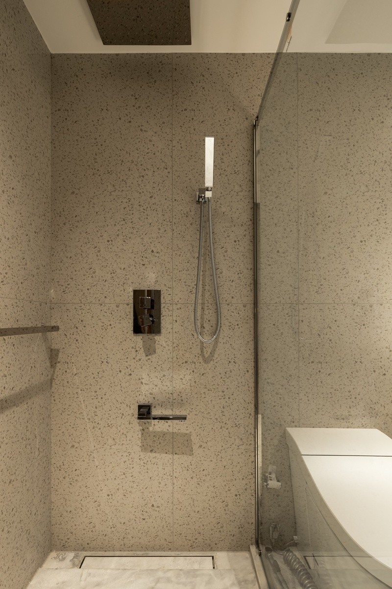 仿水磨石瓷砖铺满墙面,嵌入式五金件弱化视觉干扰,玻璃隔断保持空间通透,让洗浴场景在质朴肌理与洁净线条中,成为卸下疲惫的治愈时刻。