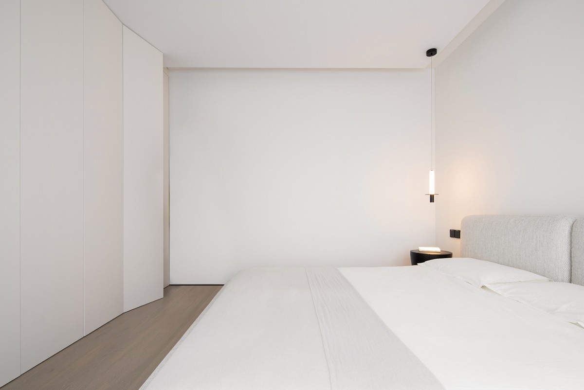 卧室以“全白极简”回归睡眠本质:弧形衣柜柔化空间棱角,浅灰布艺床头消解视觉重量,纤细吊灯洒下暖光,木质地板托举着纯白床品——没有冗余装饰,只有纯净到***的静谧,让每一夜都成为对疲惫的温柔疗愈。
