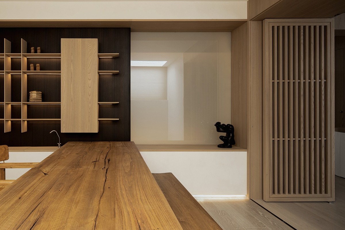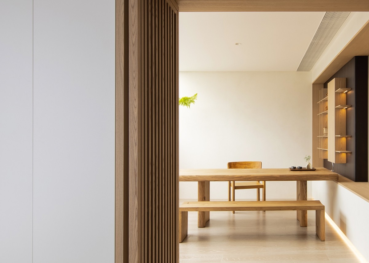 木质格栅屏风半掩着一方小天地:粗犷原木桌凳保留自然肌理,素白花瓶中蕨类植物舒展绿意,墙面与地面的米色构成柔和背景。这片空间如“呼吸的间隙”,让动线在极简与自然间从容过渡,每一次经过都成为身心的短暂休憩。