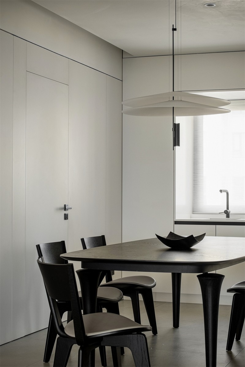 餐厅则演绎黑白灰的***秩序:深灰餐桌与黑色餐椅构建利落轮廓,层叠造型的白色吊灯如艺术装置悬浮,极简高柜隐去收纳琐碎;在这里,用餐不仅是果腹,更是一场与“克制美学”的深度共鸣。