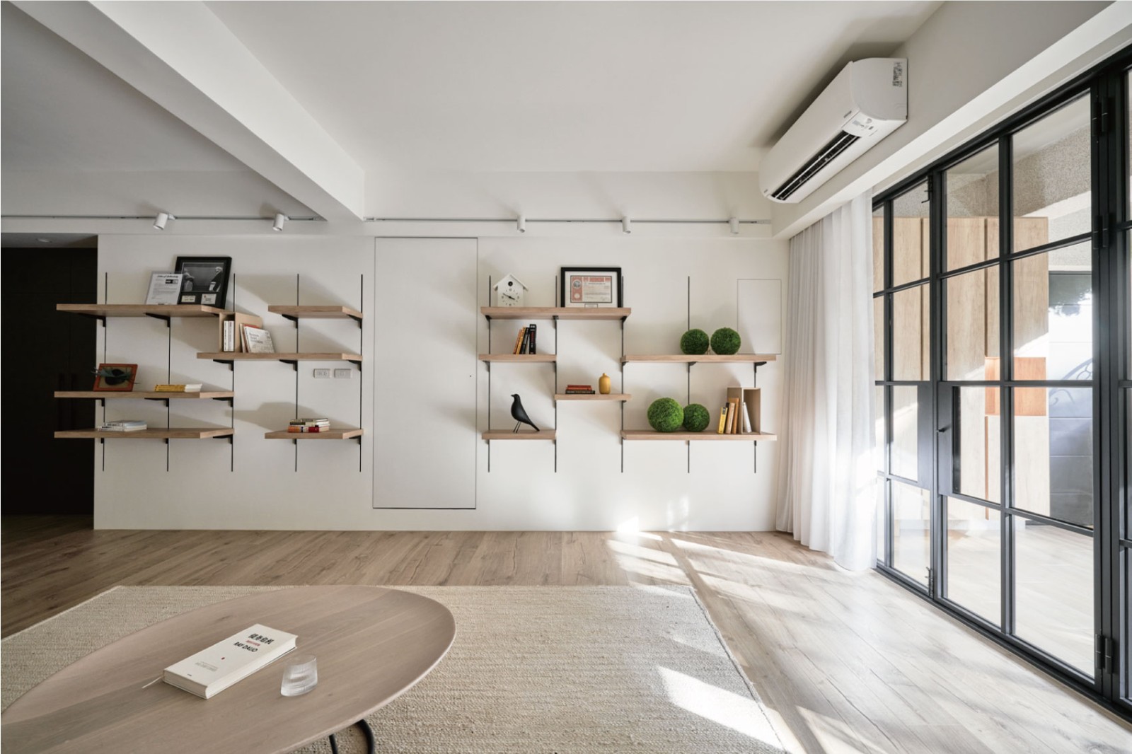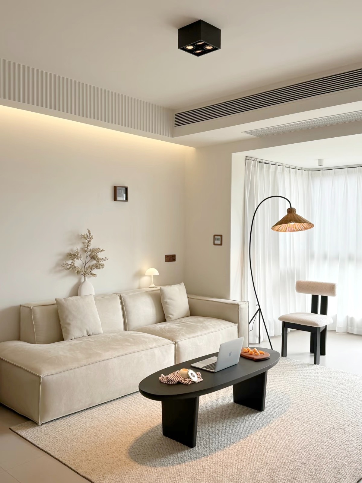 客厅以米白布艺沙发铺陈温柔基底,黑色弧形茶几如雕塑般点缀空间,波点边几与蓝色编织单椅跳出趣味节奏;半透白纱滤过天光,原木护墙传递自然温度,一株绿植悄然生长,让极简空间不再冷硬,而是盛满“呼吸感”。